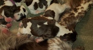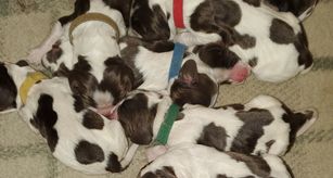 Our puppies include liver white and roan, liver white and tan, and liver and white. Colors will vary depending on the parent dogs.