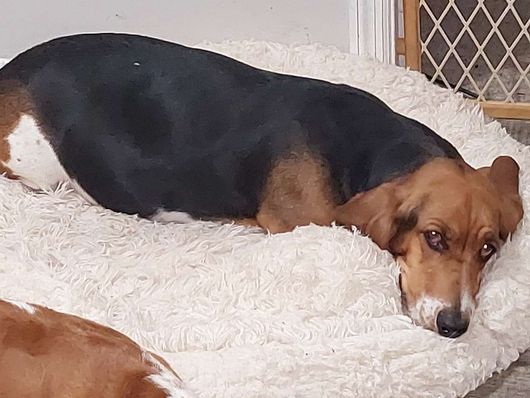 Bb/Maizie has a quiet, sweet, attention seeking nature. She is a good momma. Maizie when not being momma enjoys sleeping on the couch, playing outside and visiting her basset hound friends in Lexington Ky.