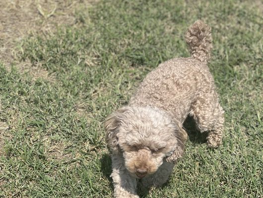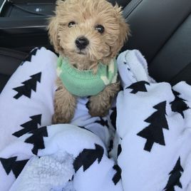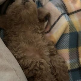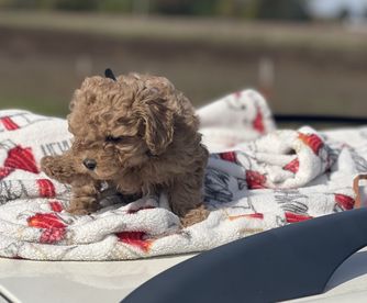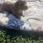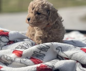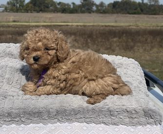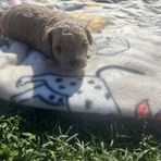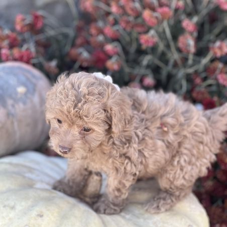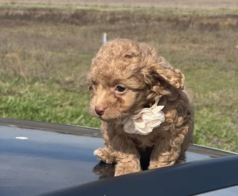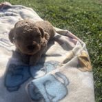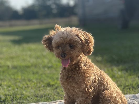 Clover is a beautiful mini poodle who loves her adventures she loves being outside hunting in the pastures or just laying on the porch. She also loves to set on your lap and snuggle in between your legs she has such a great personality and is an excellent mother. She is 10 lbs small features color red.