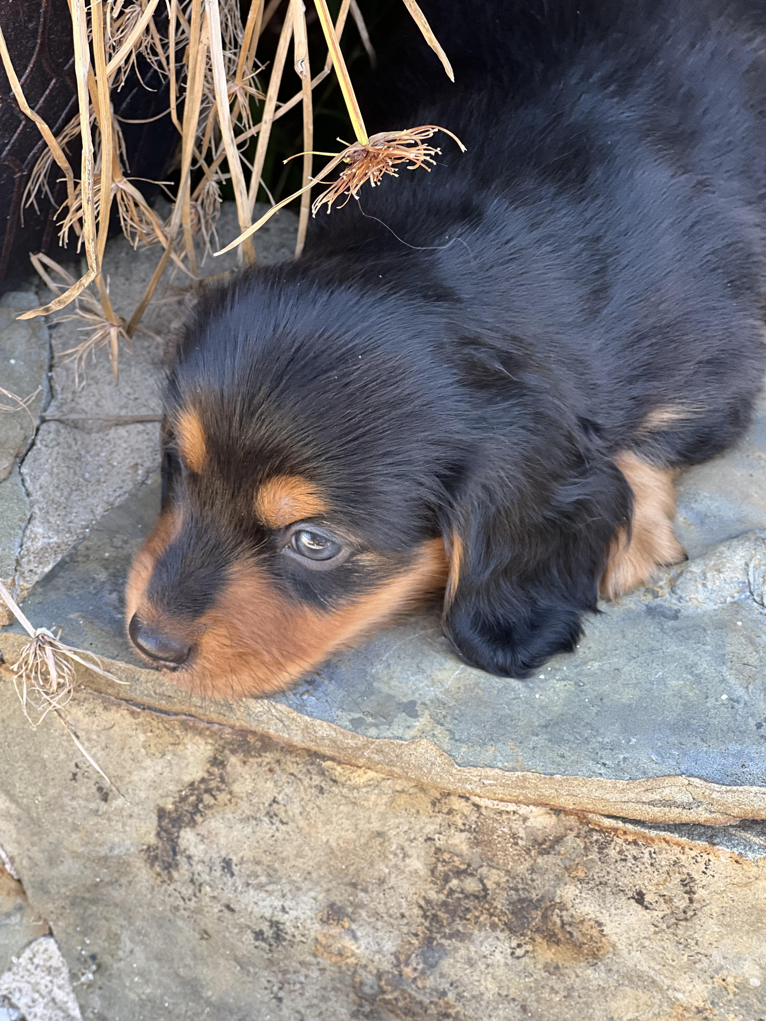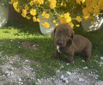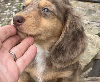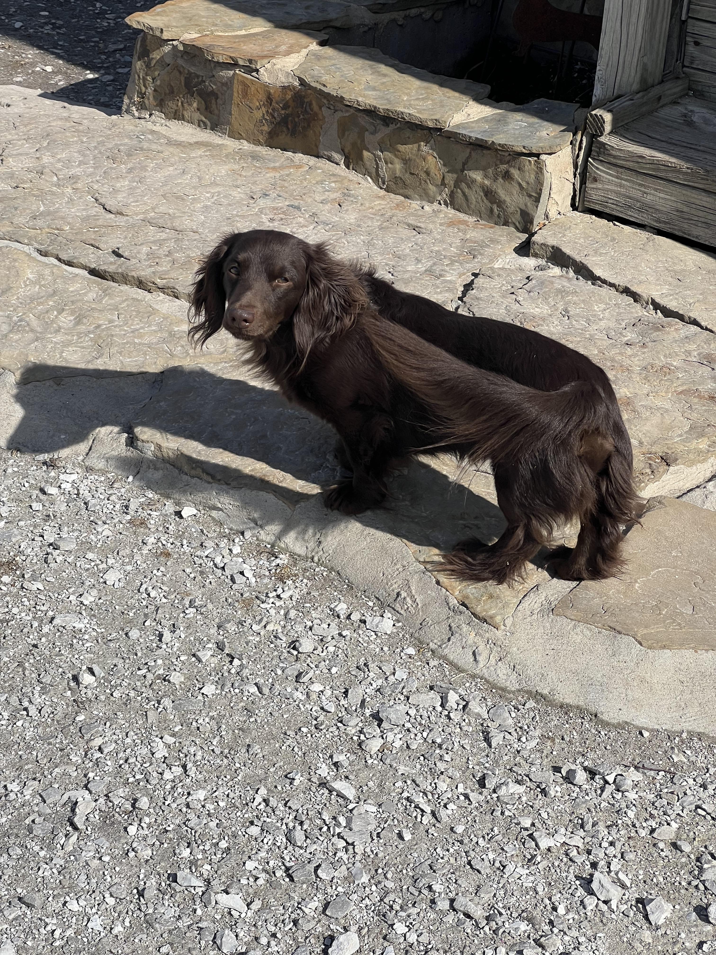 He is a beautiful longhair standard chocolate with the best disposition he is very laid back he loves playing with the other dogs and loves taking adventures in the pasture with the donkeys and horses.