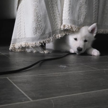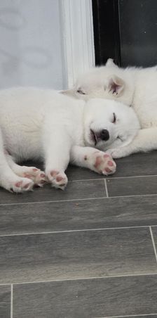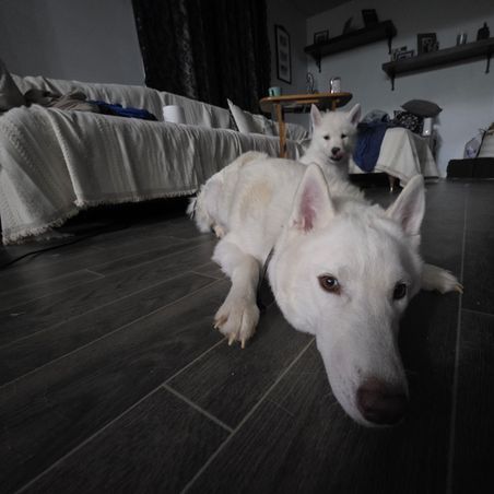 Daenerys is an all-white Siberian Husky, CKC and AKC registered. She has partial heterochromia in one eye and a beautiful pink-toned skin pigment that adds to her unique look. Daenerys is intelligent, fast, and highly trainable. She’s deeply loyal to her favorite humans and loves staying close to them. A true royal cuddle dog, she balances energy and affection perfectly.