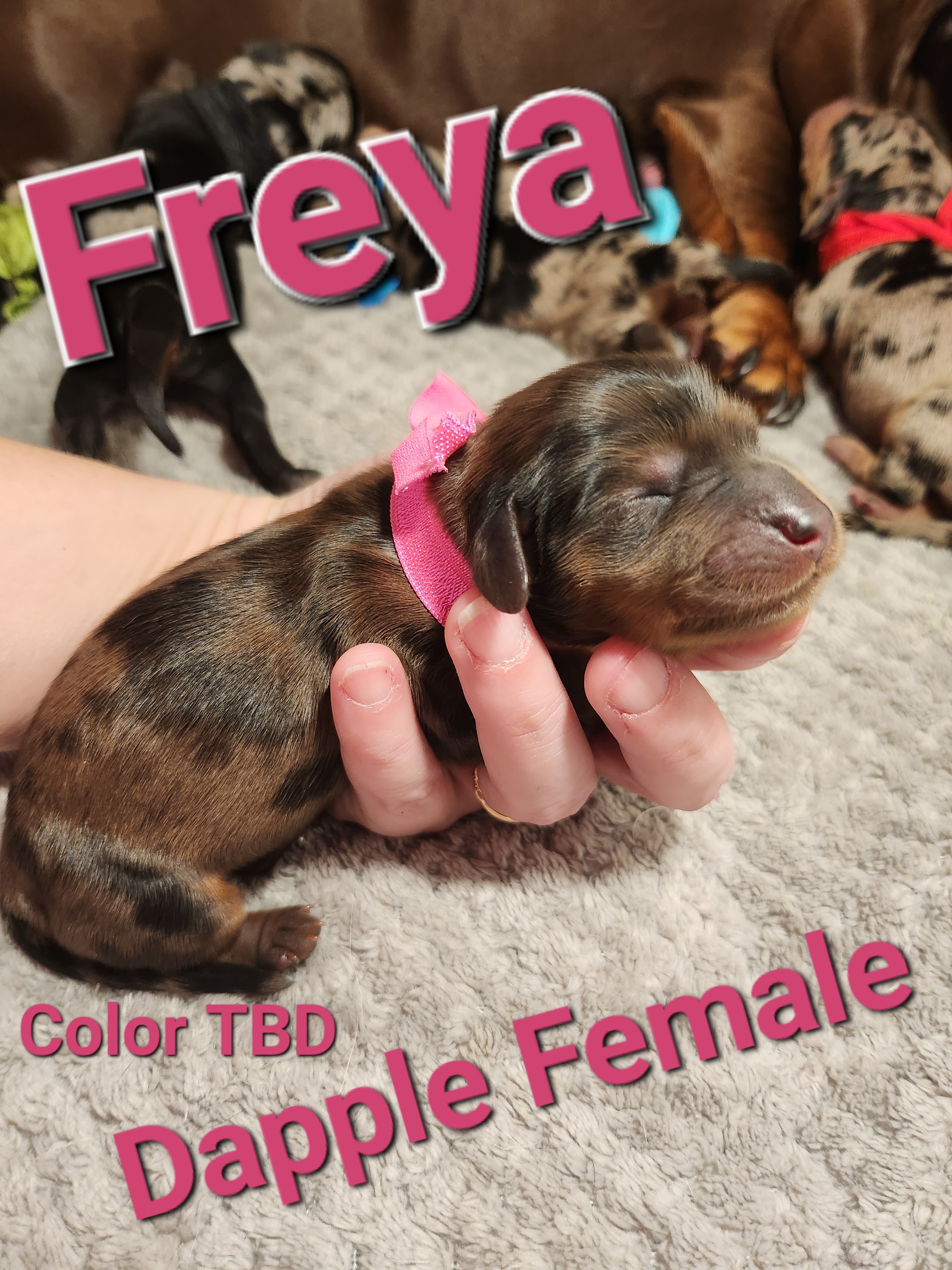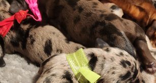 Our puppies include red, chocolate, fawn (isabella), chocolate and tan, black and tan, and dapple. Colors will vary depending on the parent dogs.