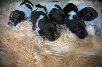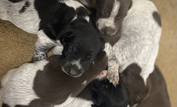 Our puppies include liver roan and black roan. Colors will vary depending on the parent dogs.