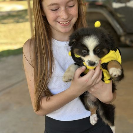 I was so pleased with this whole experience. I greatly appreciated the frequent updates about my puppy’s growth, health, and, of course, the adorable pictures. Oaky (previously Cosmic Brownie) is the sweetest, most adorable, playful, fluffy, and happy puppy we could have asked for. We knew that Aussies were smart but she has exceeded expectations—after one week with her (9 weeks old) she already knows some basic commands like sit and she has made progress with potty training. She has been great around people and our close friends and family’s dogs. We love her so much and are extremely grateful that Alicia and Huddleston Farm took great care of her and facilitated us bringing her home.