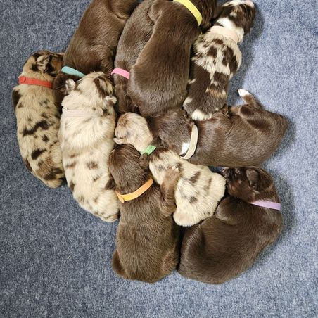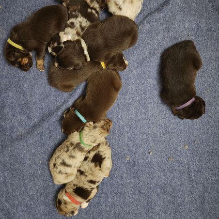 Our puppies include black, red merle, blue merle, and red. Colors will vary depending on the parent dogs.