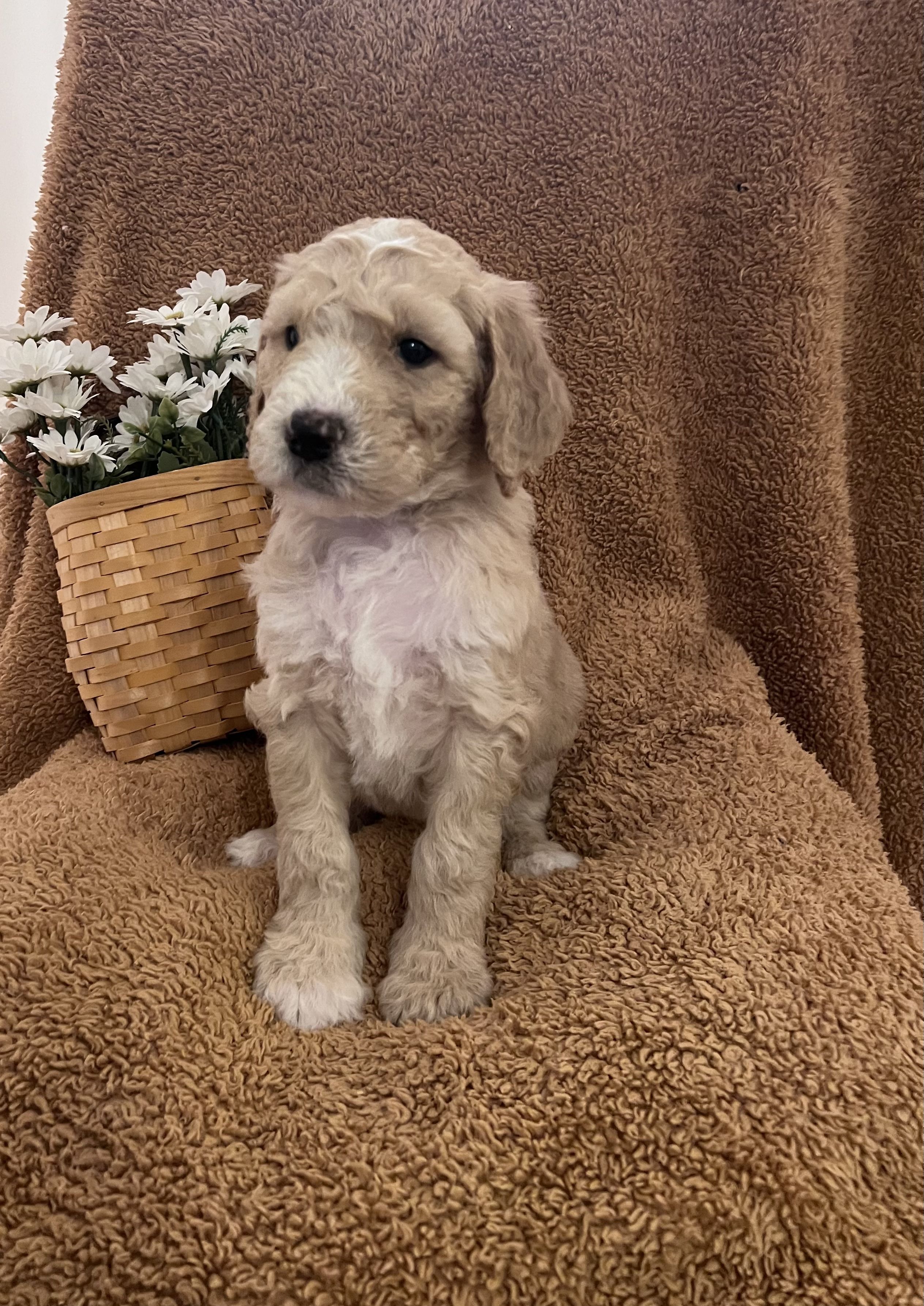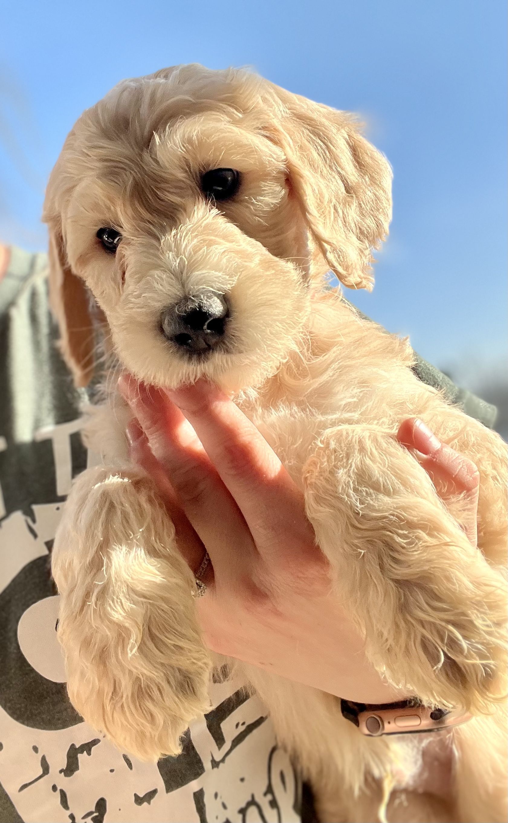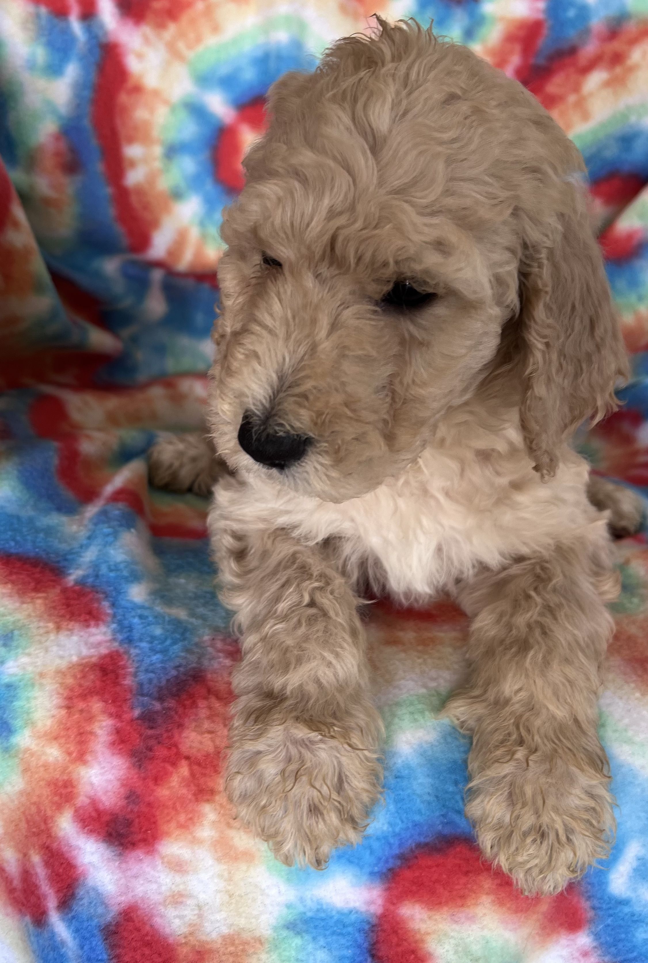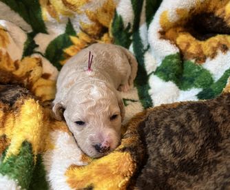 Goldendoodle puppies are cream. Colors will vary depending on the parent dogs.