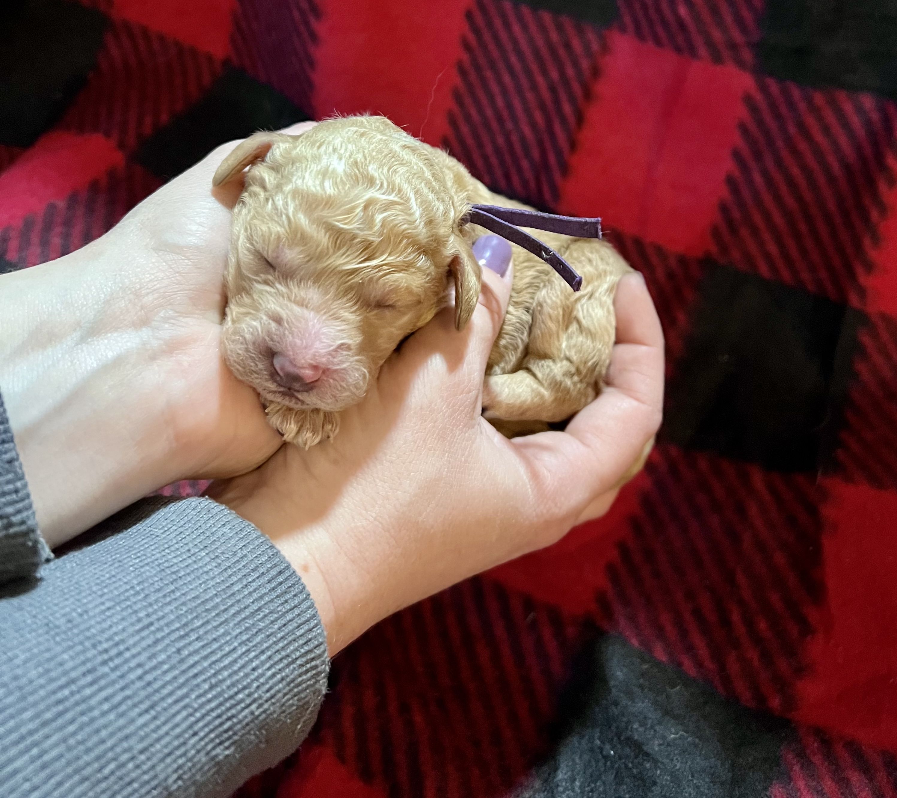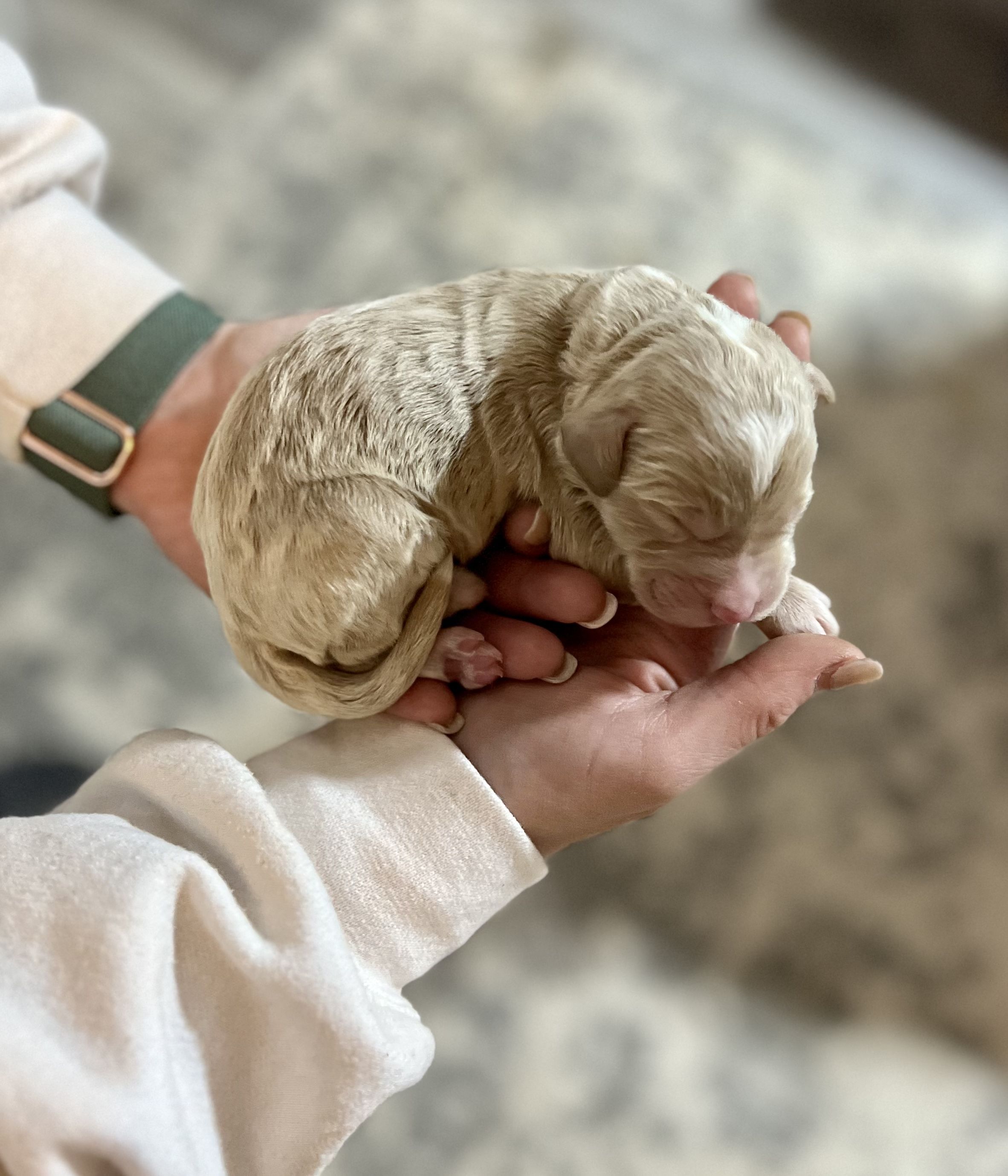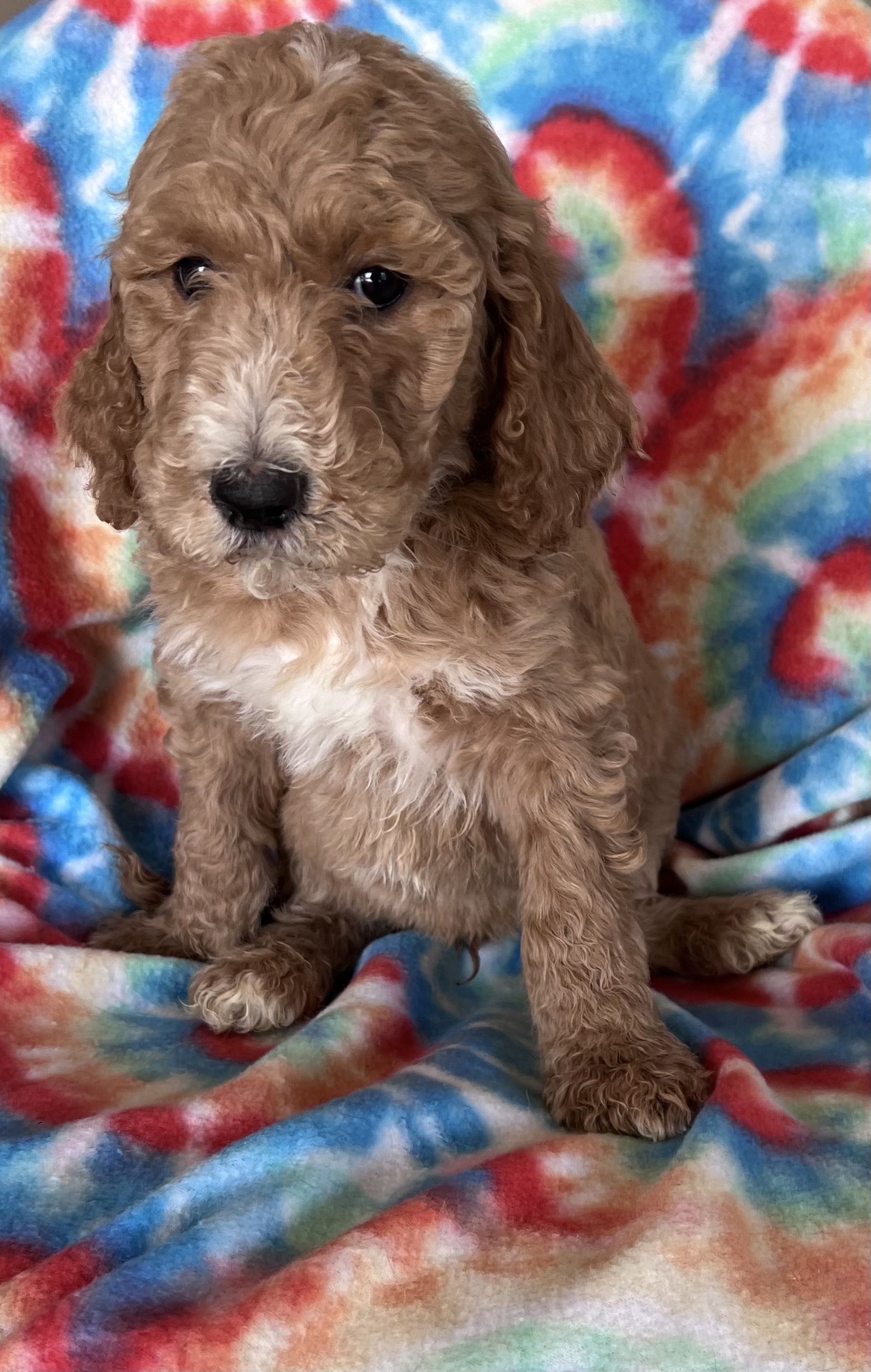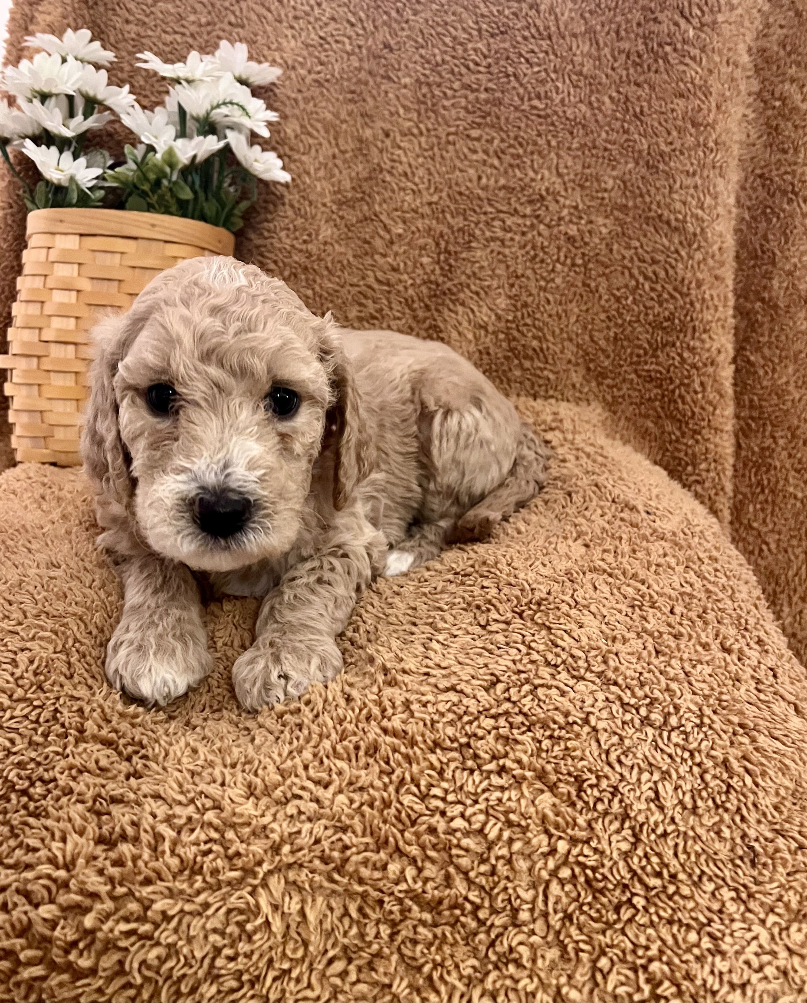 Goldendoodle puppies are cream. Colors will vary depending on the parent dogs.