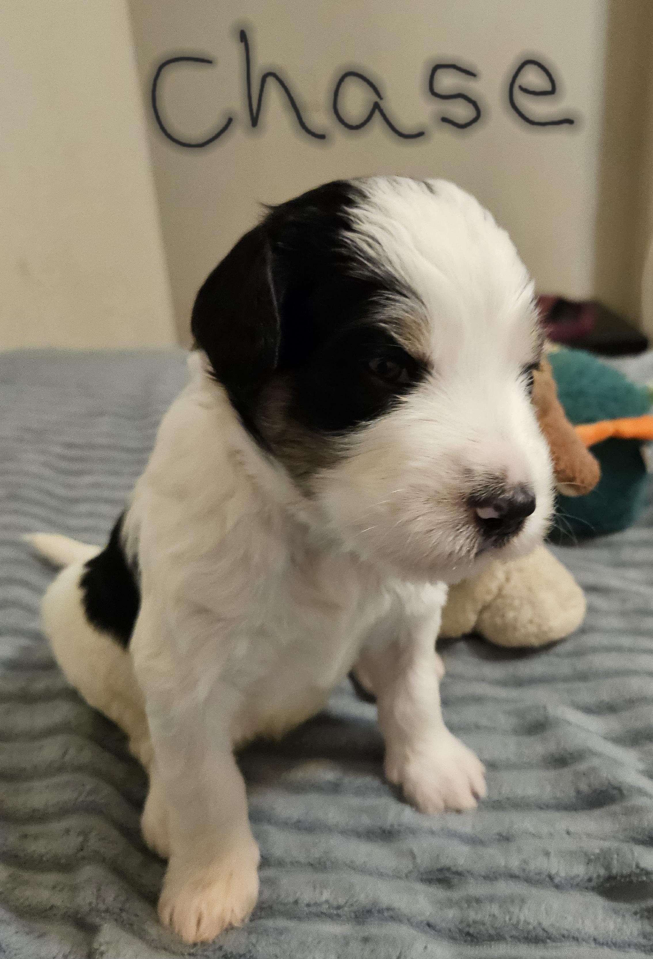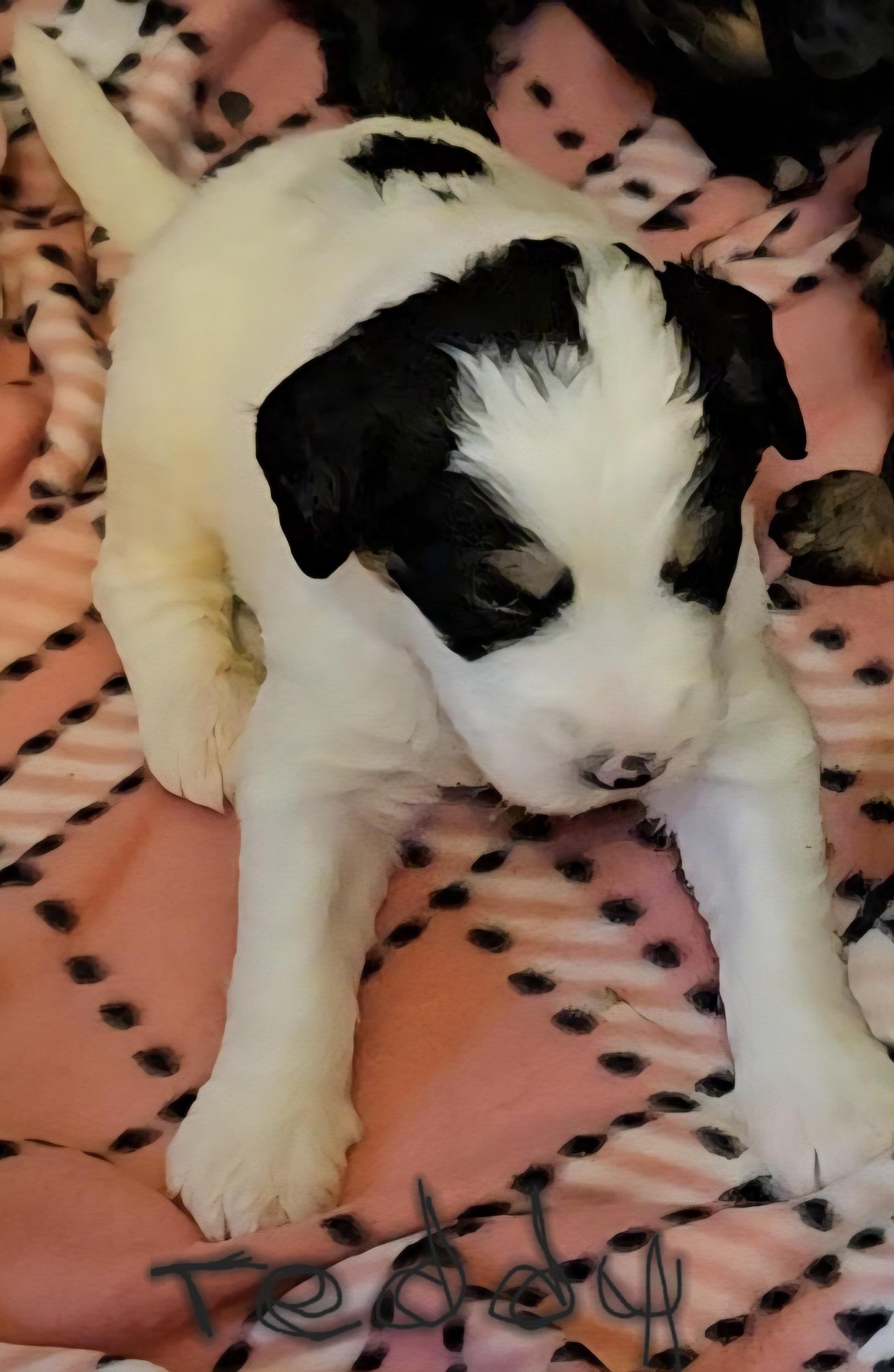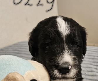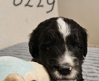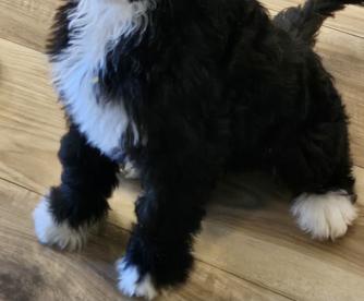 Say hello to Mojo, our remarkable F2B Bernedoodle sire, named for his magical ability to bring happiness wherever he goes. Weighing 60 pounds with a soft, curly black and white coat, Mojo is not only handsome but also genetically health tested and fully cleared by our vet for breeding.