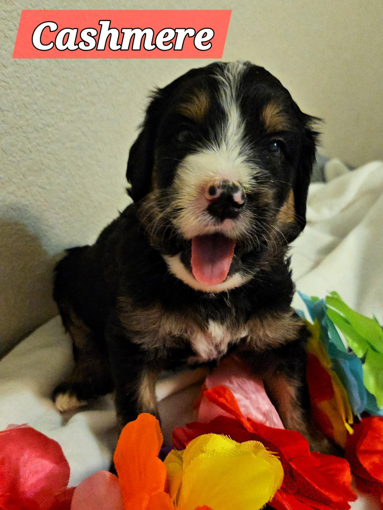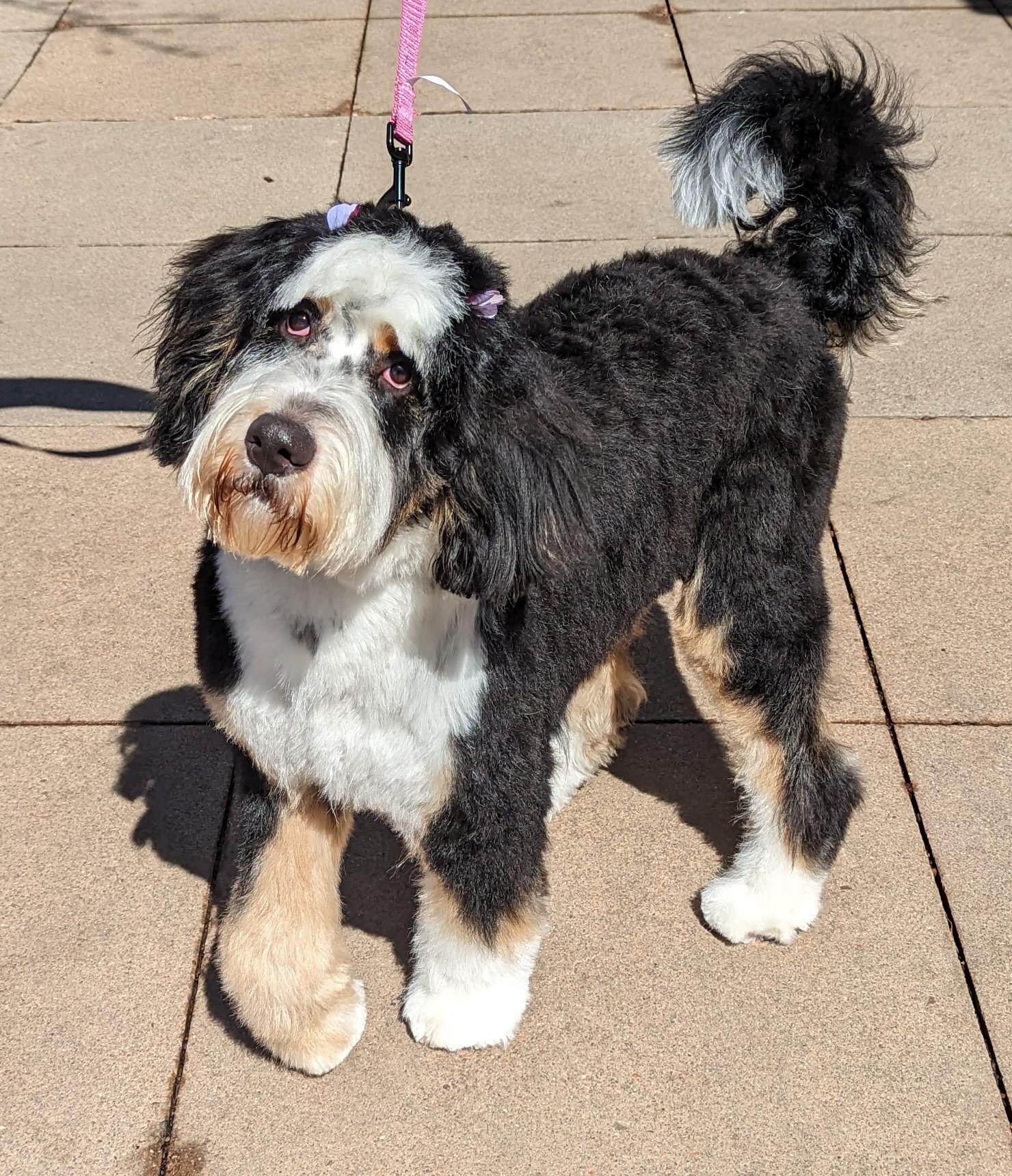 Kenzie is a stunning F1 Bernedoodle who brings the best of both worlds into our breeding program. She was genetically screened and cleared by our veterinarian, and she was carefully selected to reinforce the calm strength and loyal spirit of the Bernese Mountain Dog in our lines. With her beautiful tri-colored coat of loose curls—easy to groom and full of personality—Kenzie stands out both in looks and temperament.