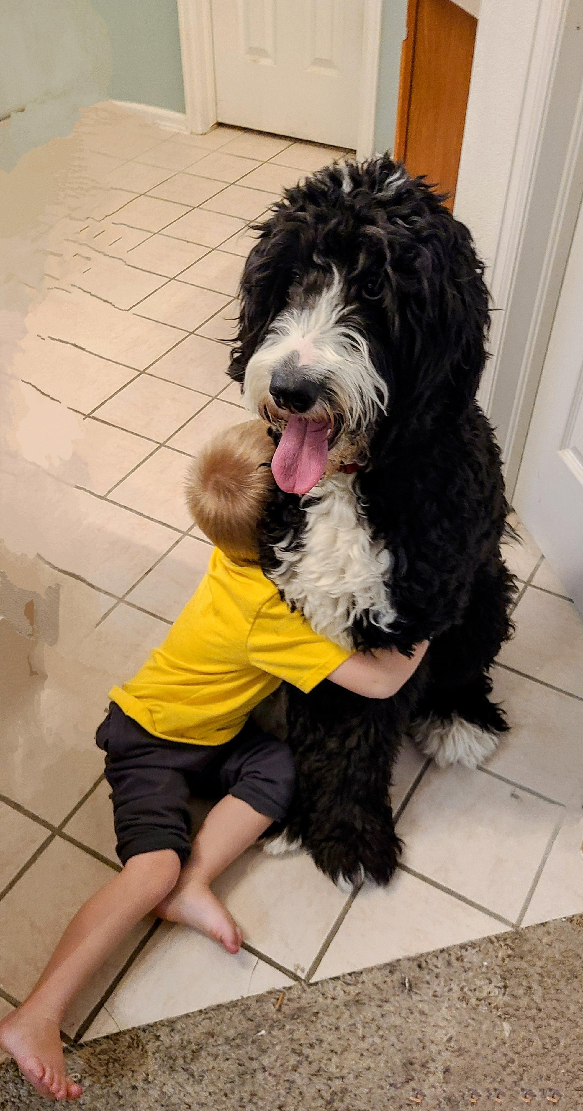 Sandy and Rob first bred border collies. A few of their puppies compete nationally for dock diving and frisbee. When Rob's dog, Wonder Dog, died unexpectedly Rob knew that he needed to switch breeds to keep from comparing the new dog to Wonder Dog. After much research we decided on Bernedoodles principally because it was important that they do well with our 2 and 3 year old grand children.