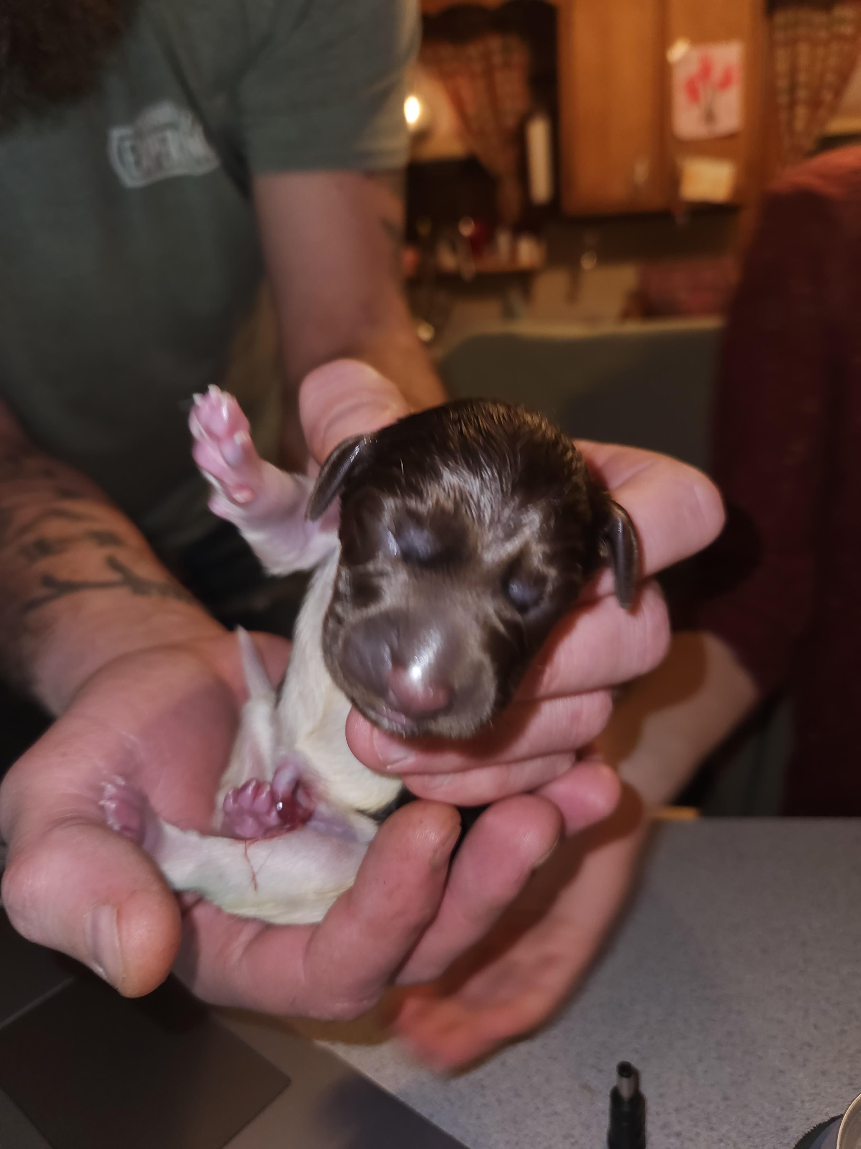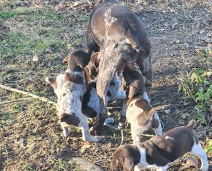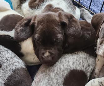 Our puppies include liver roan and liver and white. Colors will vary depending on the parent dogs.