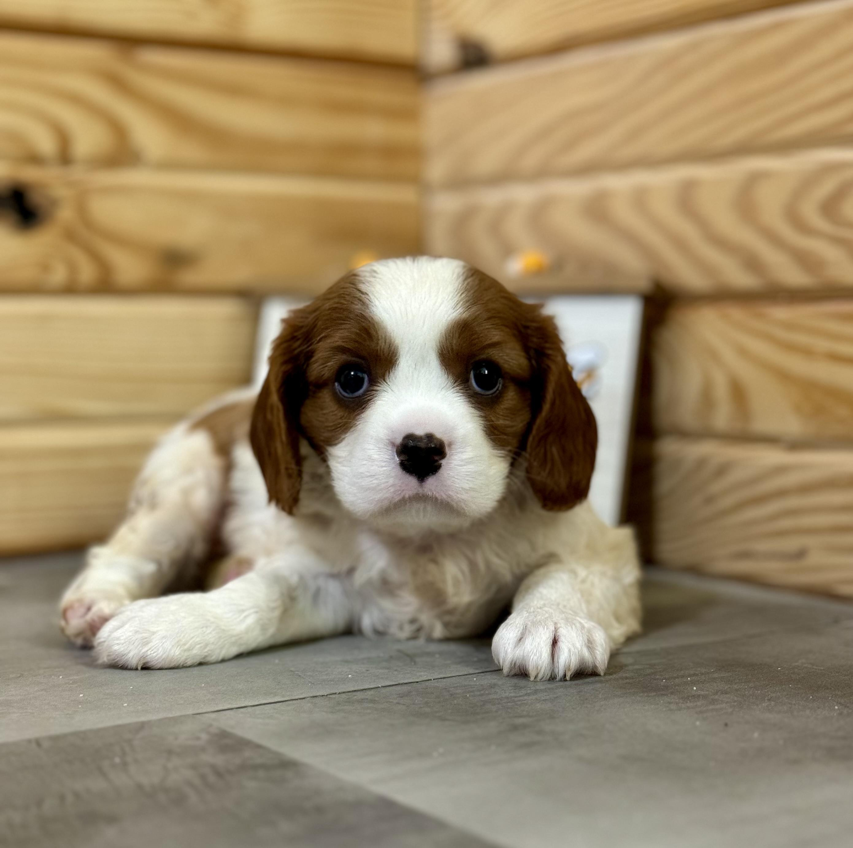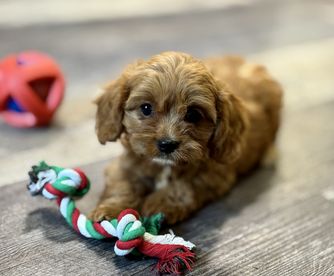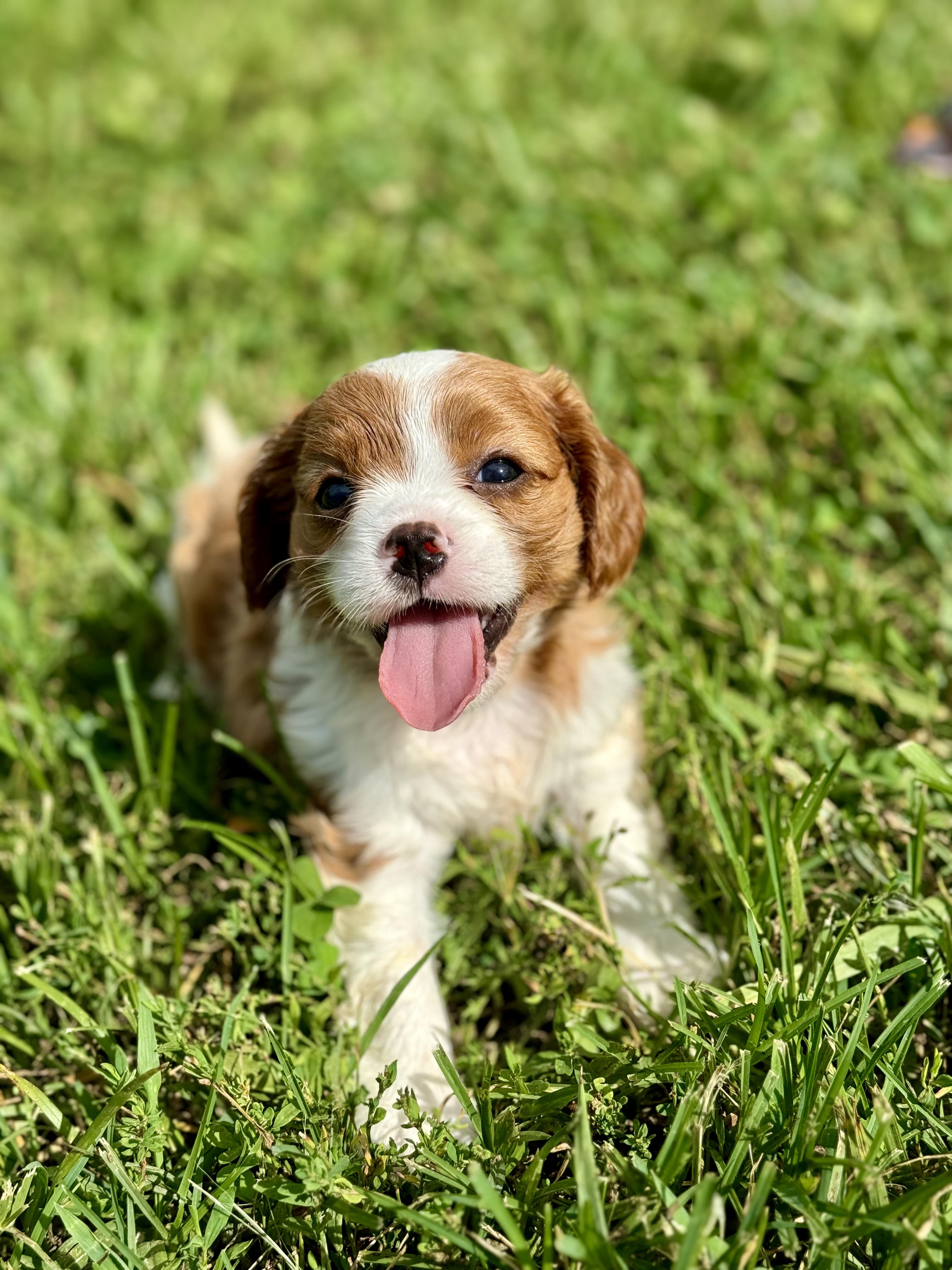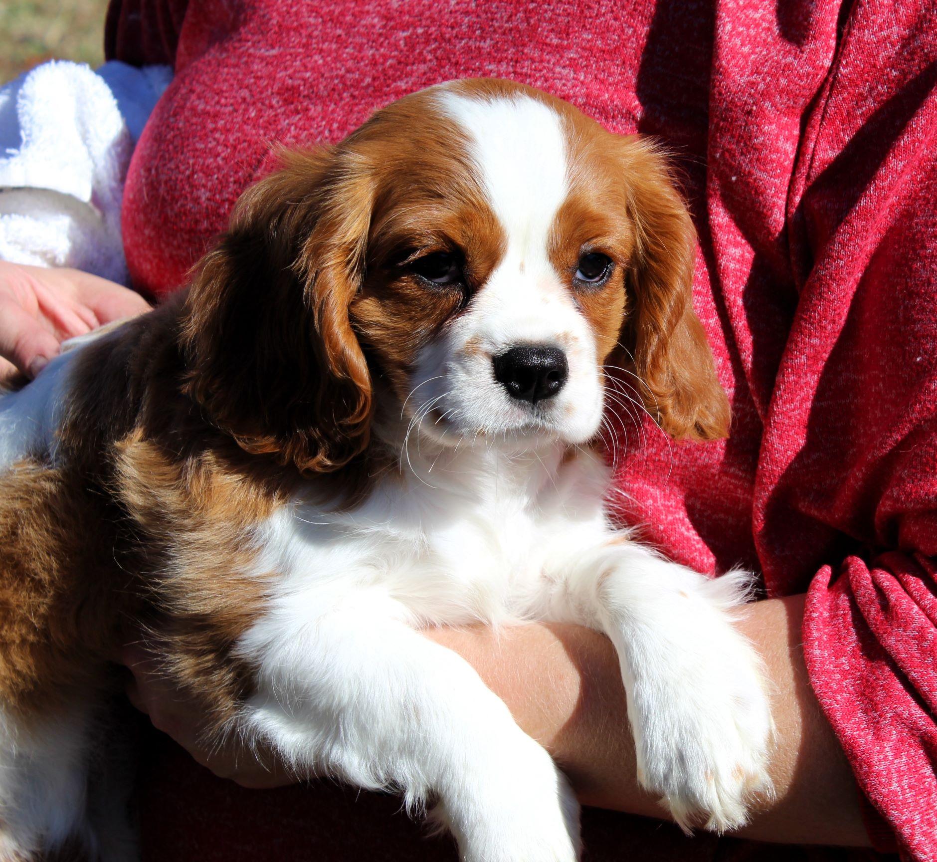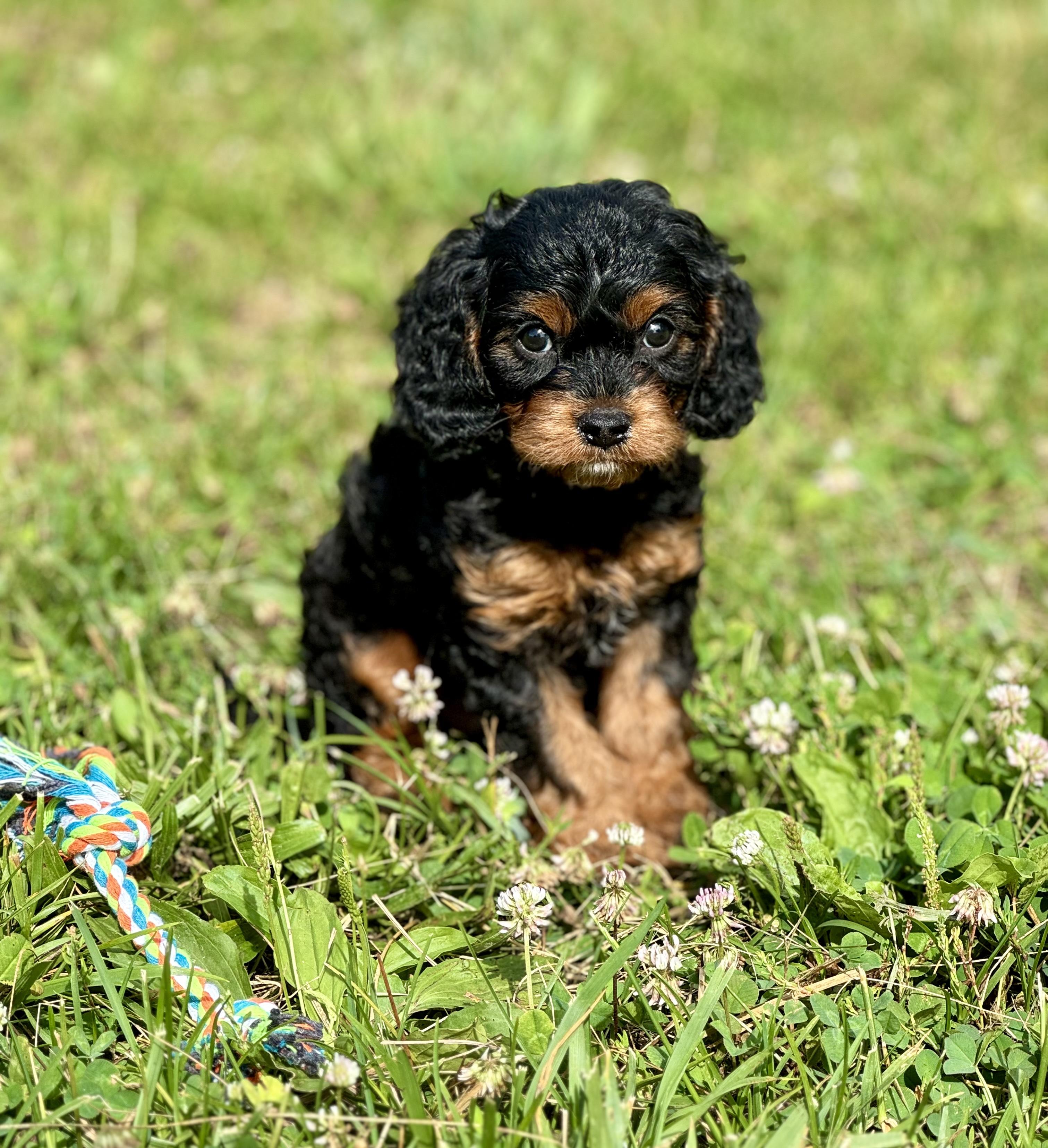 Our Cavapoo puppies include black and tan and apricot. Cavalier King Charles Spaniel puppies include blenheim, ruby, tri-color, and black and tan. Colors will vary depending on the parent dogs.