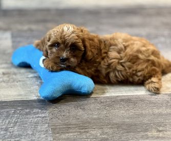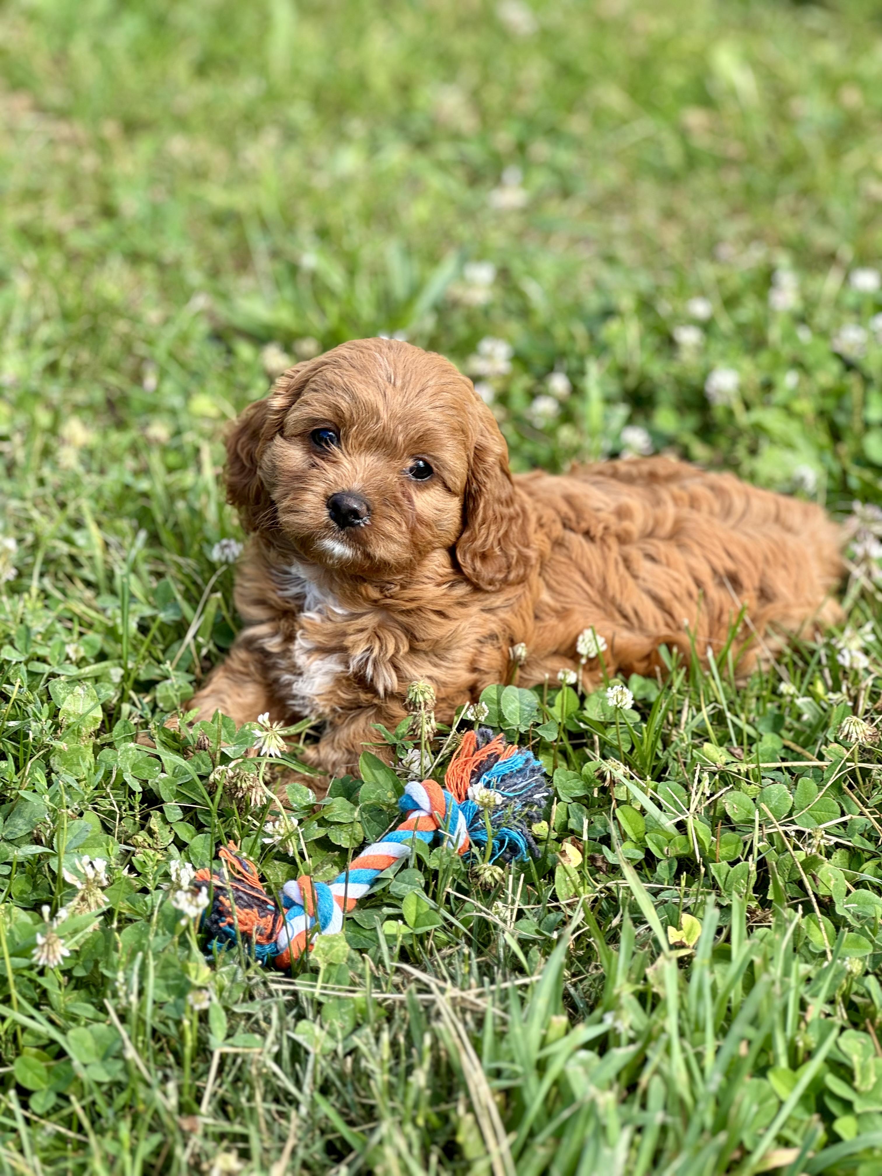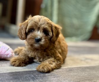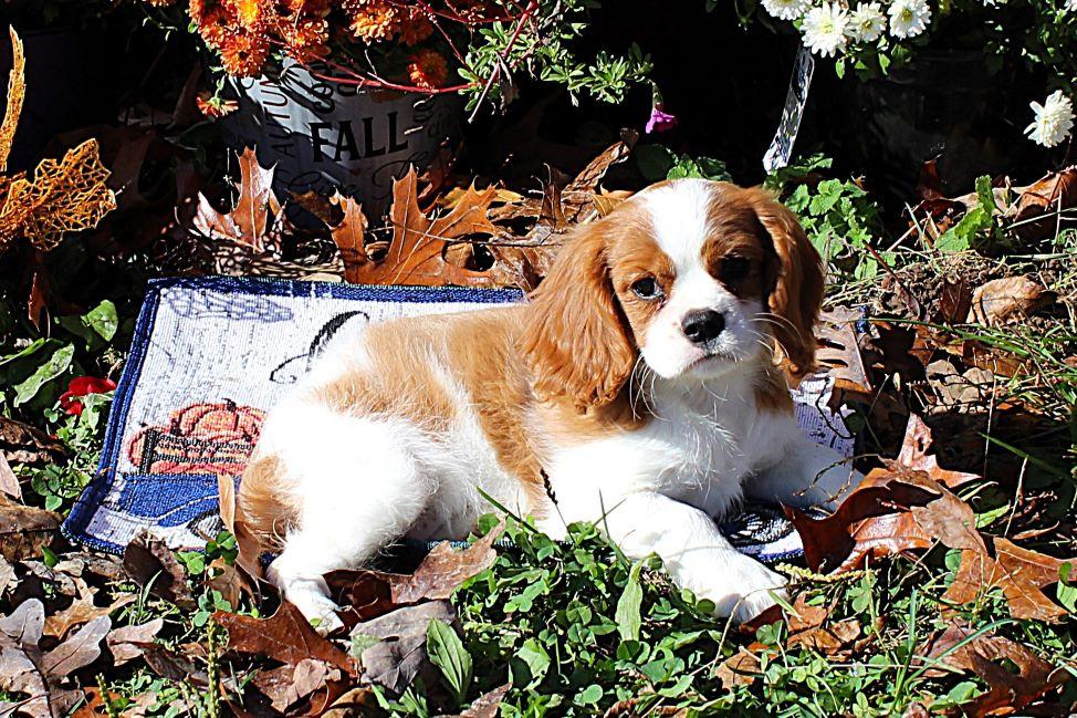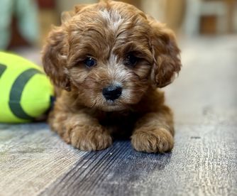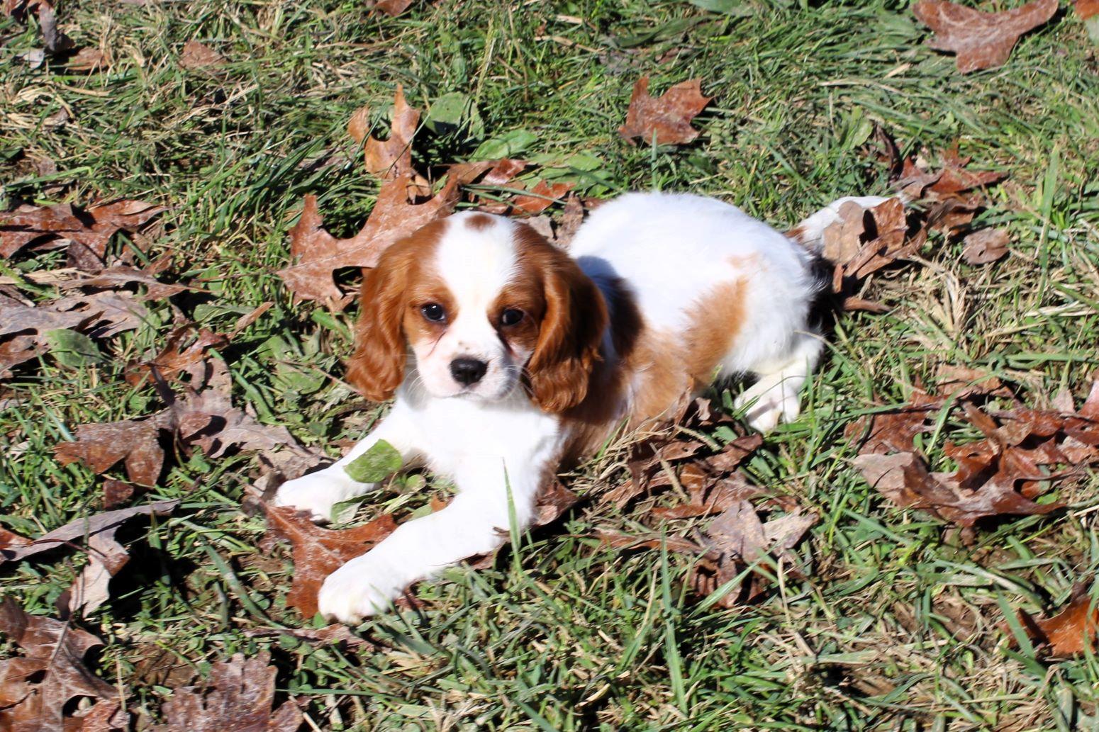 Our Cavapoo puppies include black and tan and apricot. Cavalier King Charles Spaniel puppies include blenheim, ruby, tri-color, and black and tan. Colors will vary depending on the parent dogs.