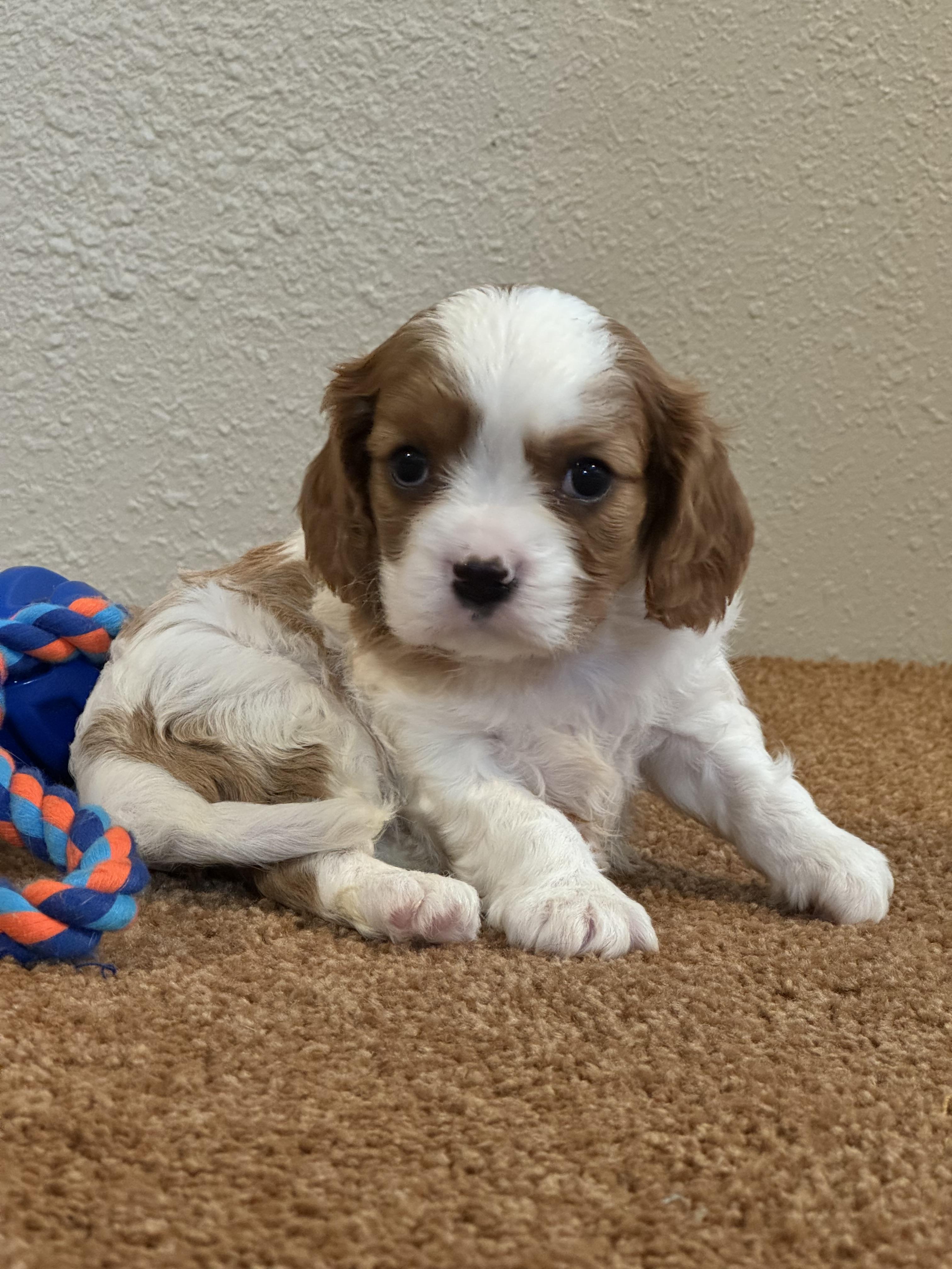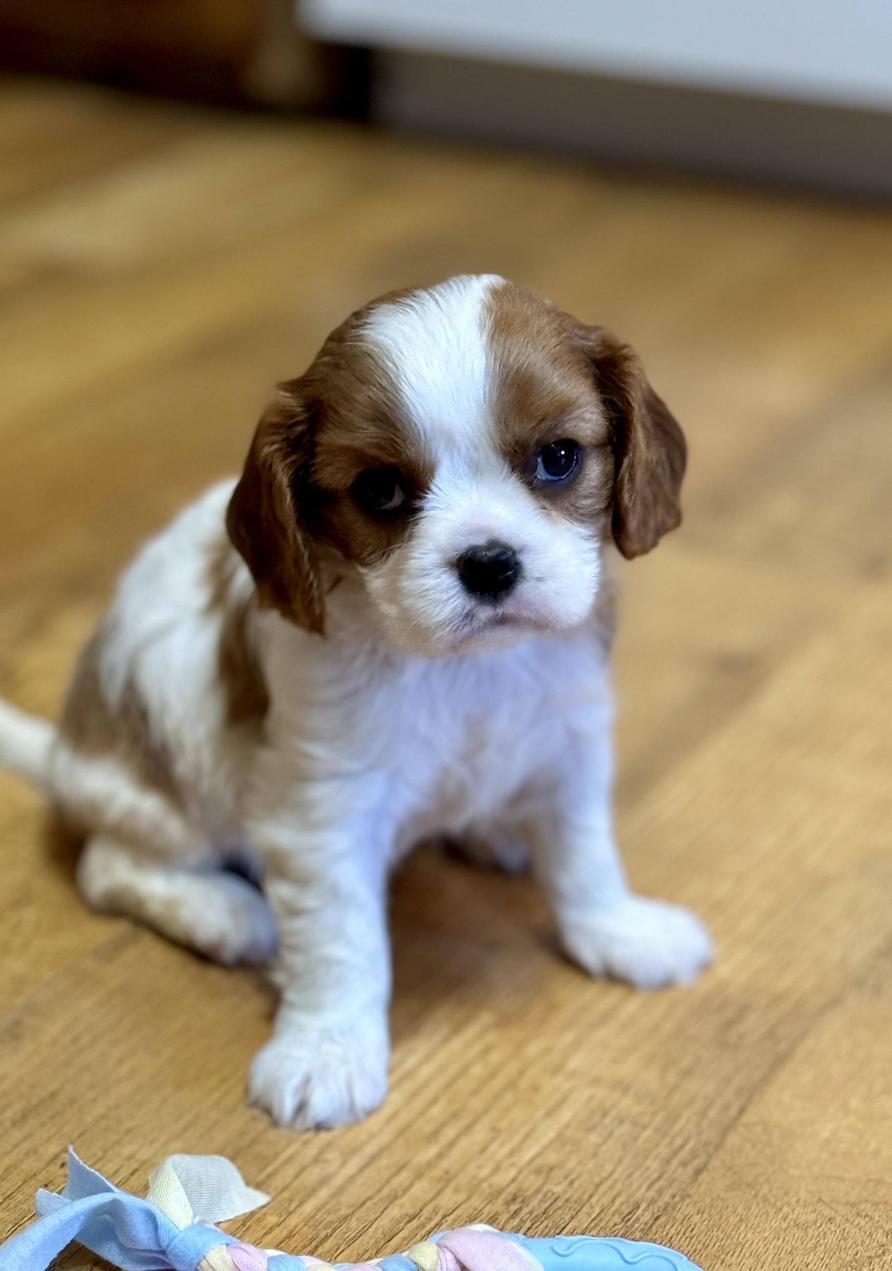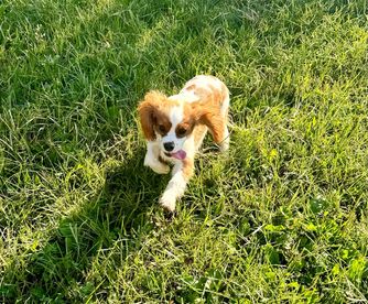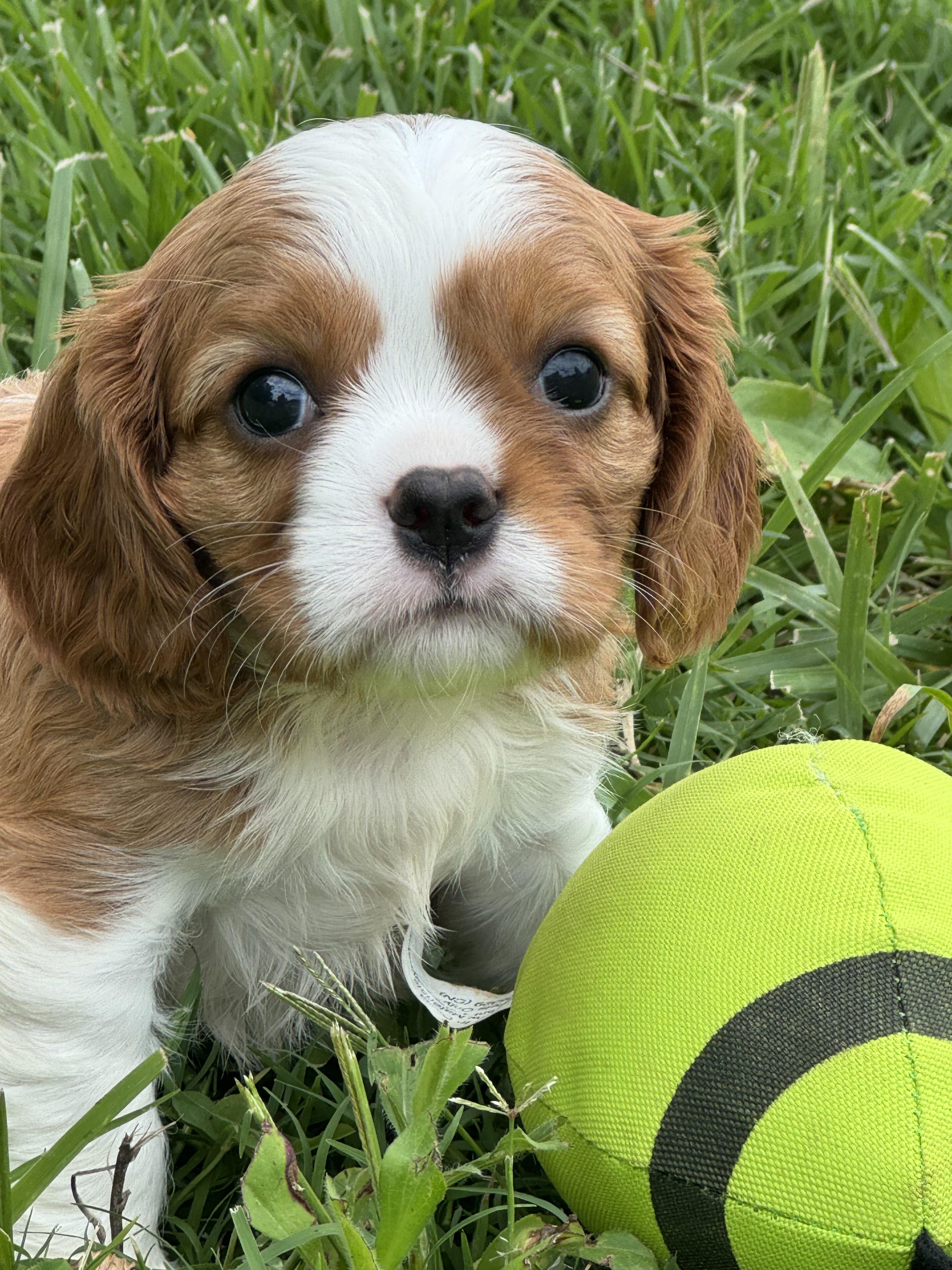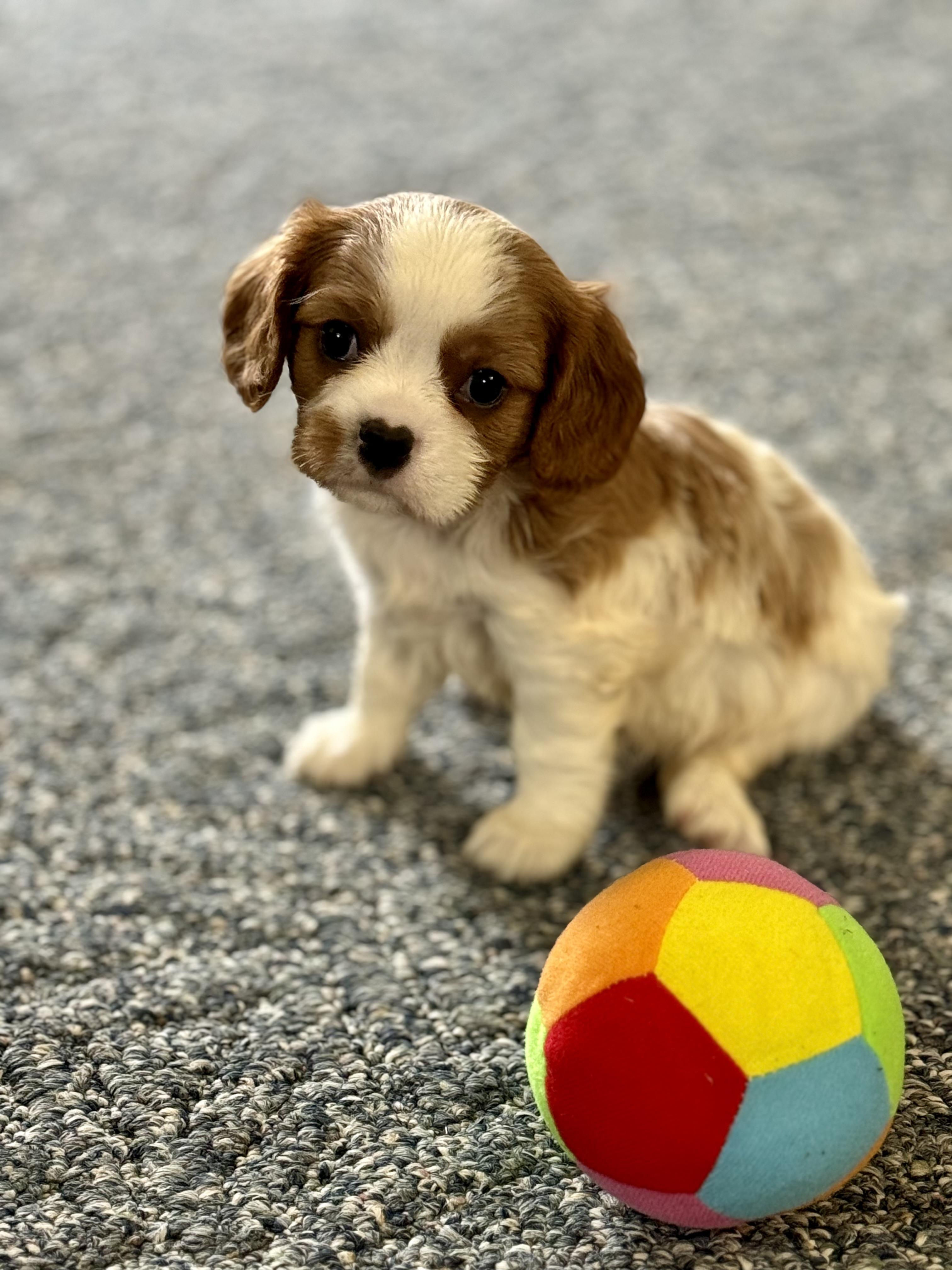 Our Cavapoo puppies include black and tan and apricot. Cavalier King Charles Spaniel puppies include blenheim, ruby, tri-color, and black and tan. Colors will vary depending on the parent dogs.