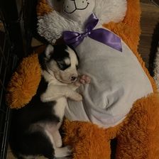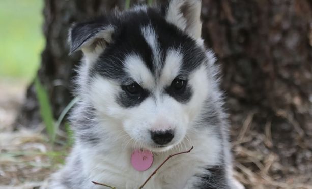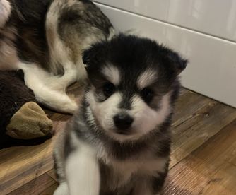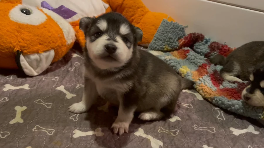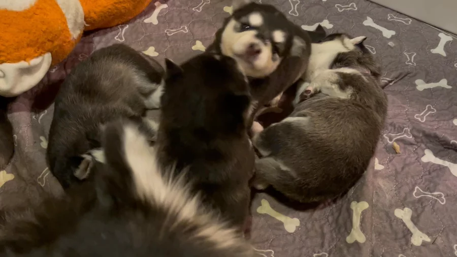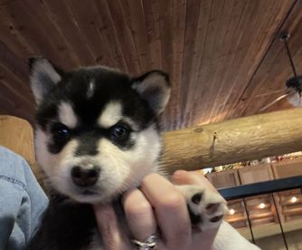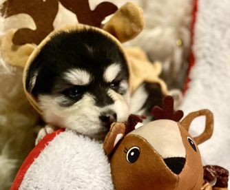 Our Pomsky puppies are black and white. Siberian Husky puppies include gray and white, red and white, and black and white. Colors will vary depending on the parent dogs.