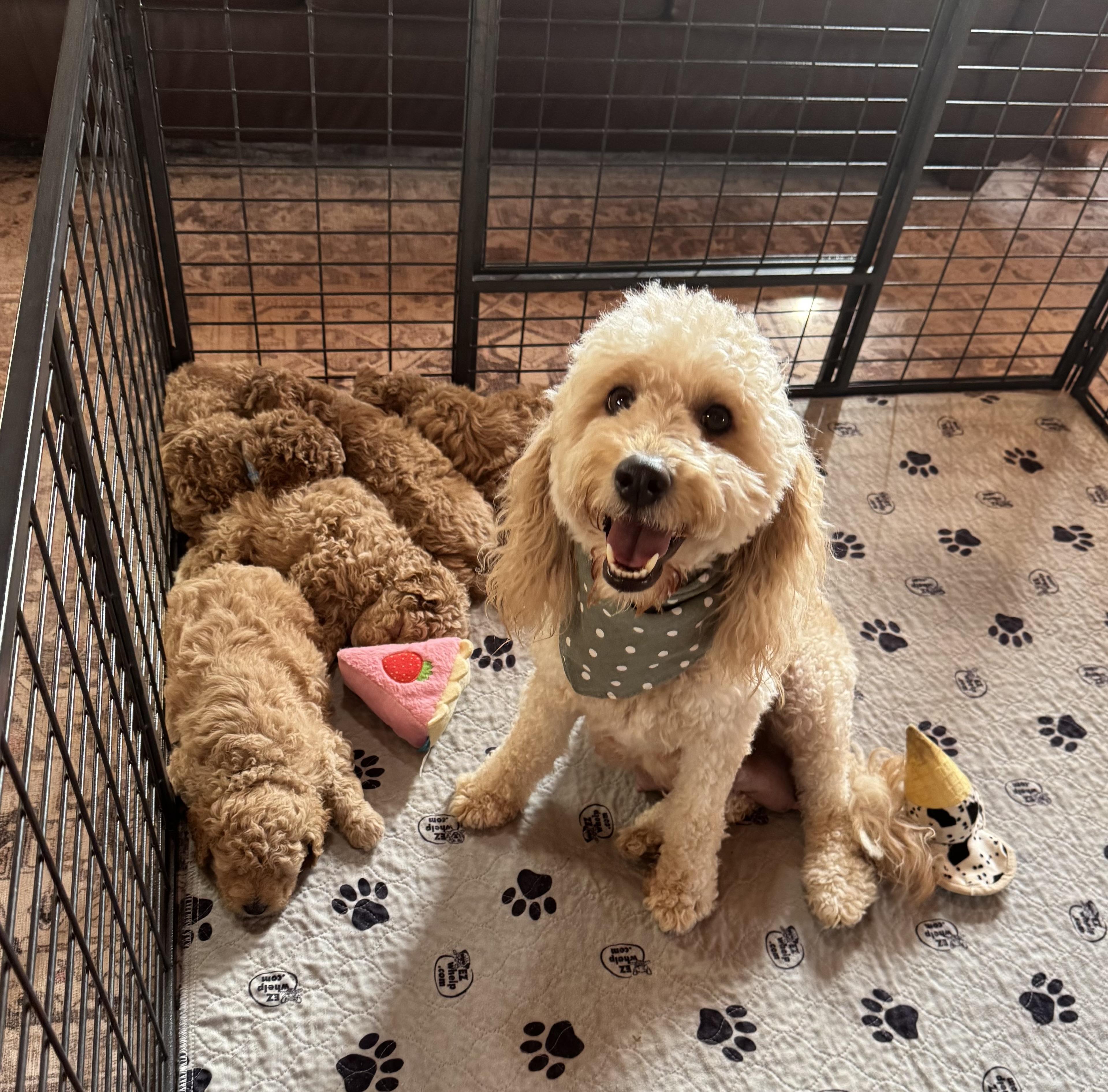 Prim is a female Goldendoodle. Carefully selected as a great representative of her breed, Erin decided to make her part of their program. Erin has passed Good Dog’s screening process, which involved a review of their breeding practices, environment, and the mental and physical health of their dogs.