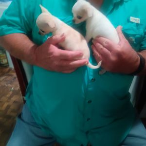 One male puppy left. 2.5 lbs. White with fawn coloring. He loves chasing other puppies.