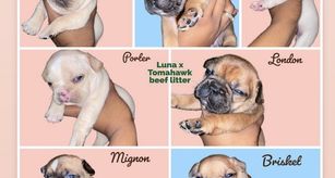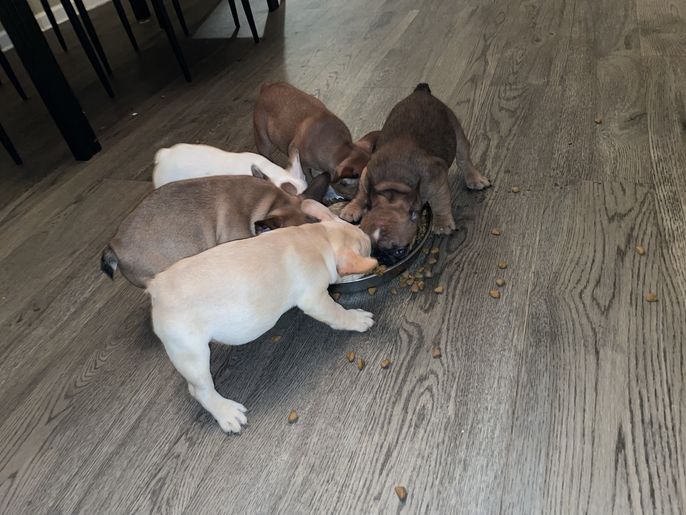 Our puppies include fawn and fawn and white. Colors will vary depending on the parent dogs.