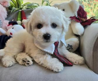 Our Bichon Frise puppies are white. Maltipoo puppies are champagne. Shichon puppies are brown and white. Shih Tzu puppies include chocolate, tricolor, and black and white. Colors will vary depending on the parent dogs.