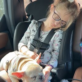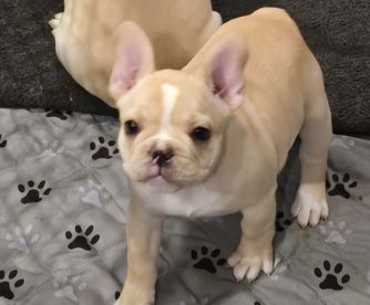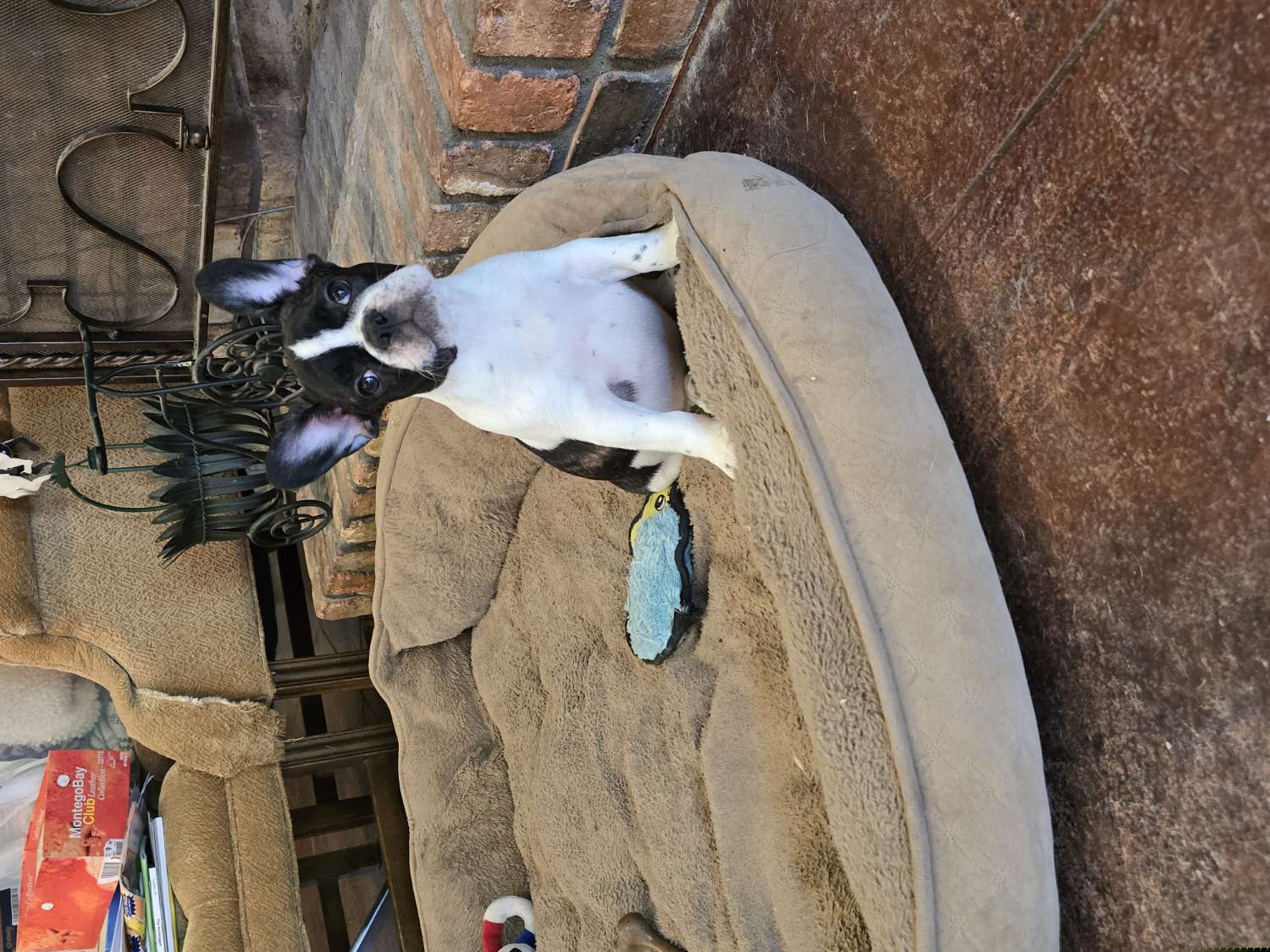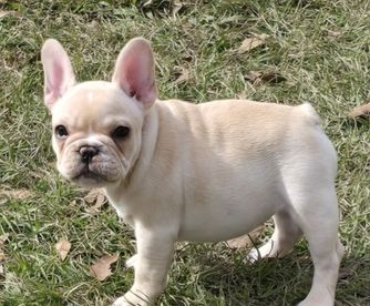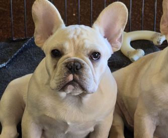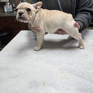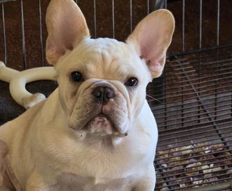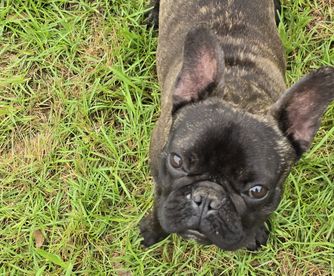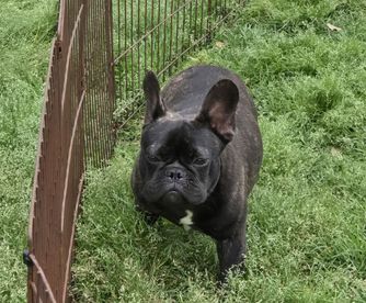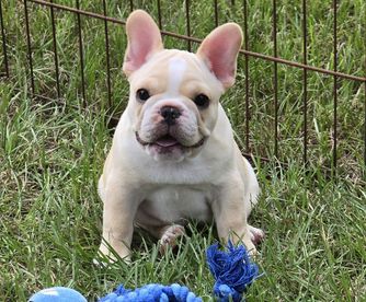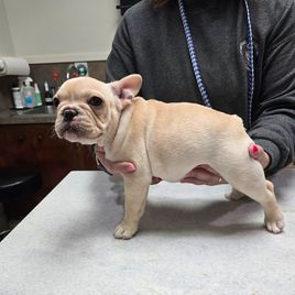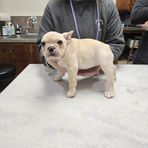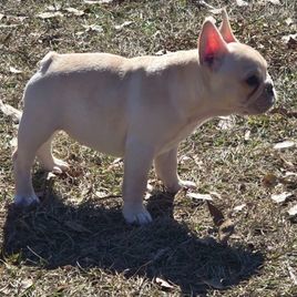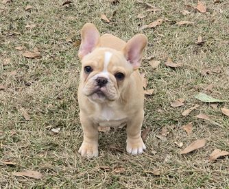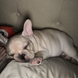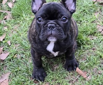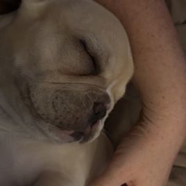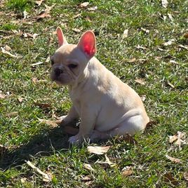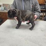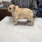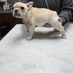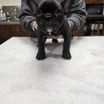 Fig is a pure delight. He is such a great size...square and cobby. The biggest attribute that others notice, along with us, is he is the chillest French Bulldog we have ever seen. Super laid back and loving. He takes a running start for the "one" side step as he is a little low to the ground and he's afraid he won't make the step. We have had his heart and patellas checked. We are thrilled with this first litter of his.