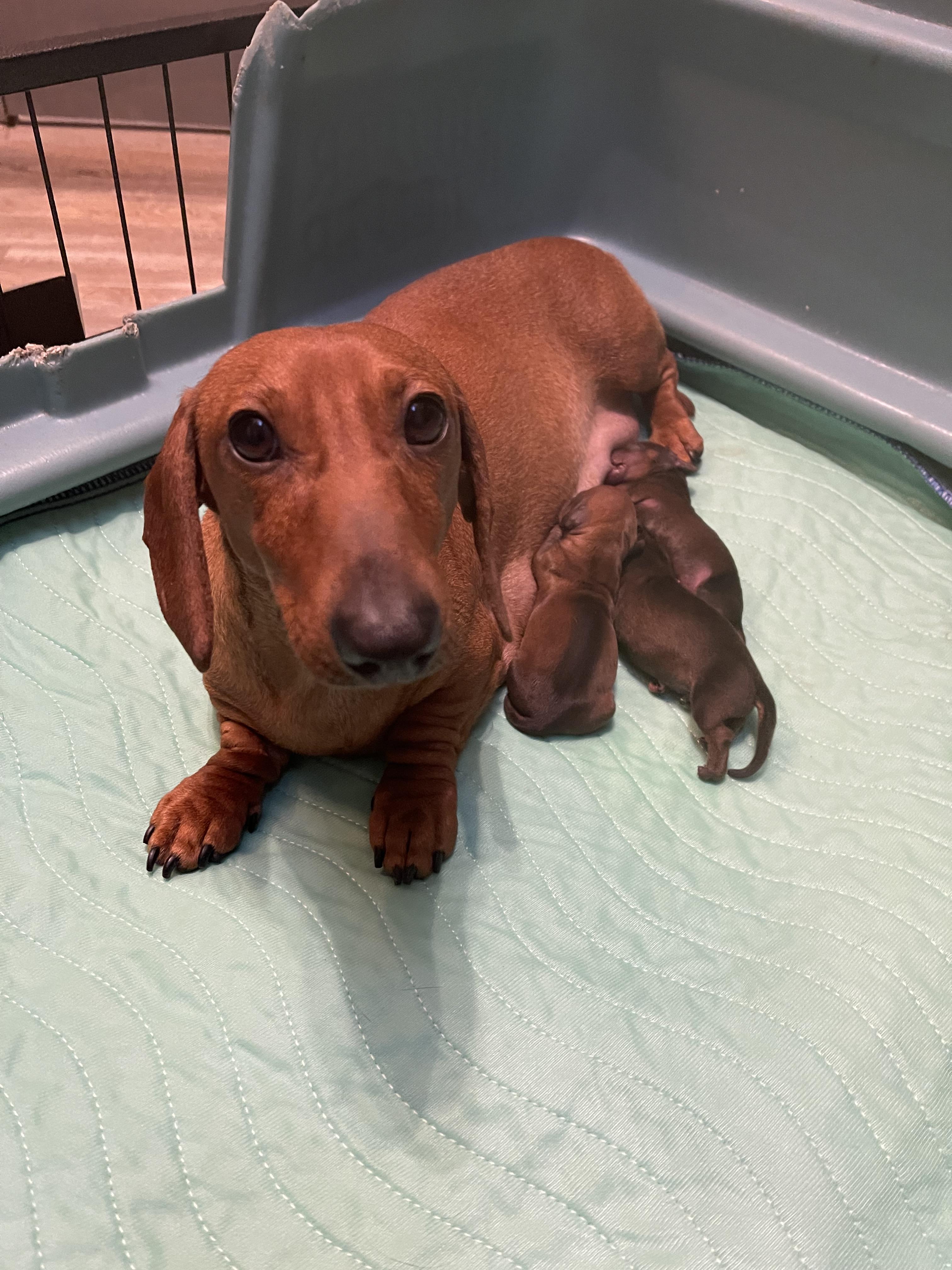 Snitch is a female Dachshund. Carefully selected as a great representative of her breed, Christine decided to make her part of their program. Christine has passed Good Dog’s screening process, which involved a review of their breeding practices, environment, and the mental and physical health of their dogs.