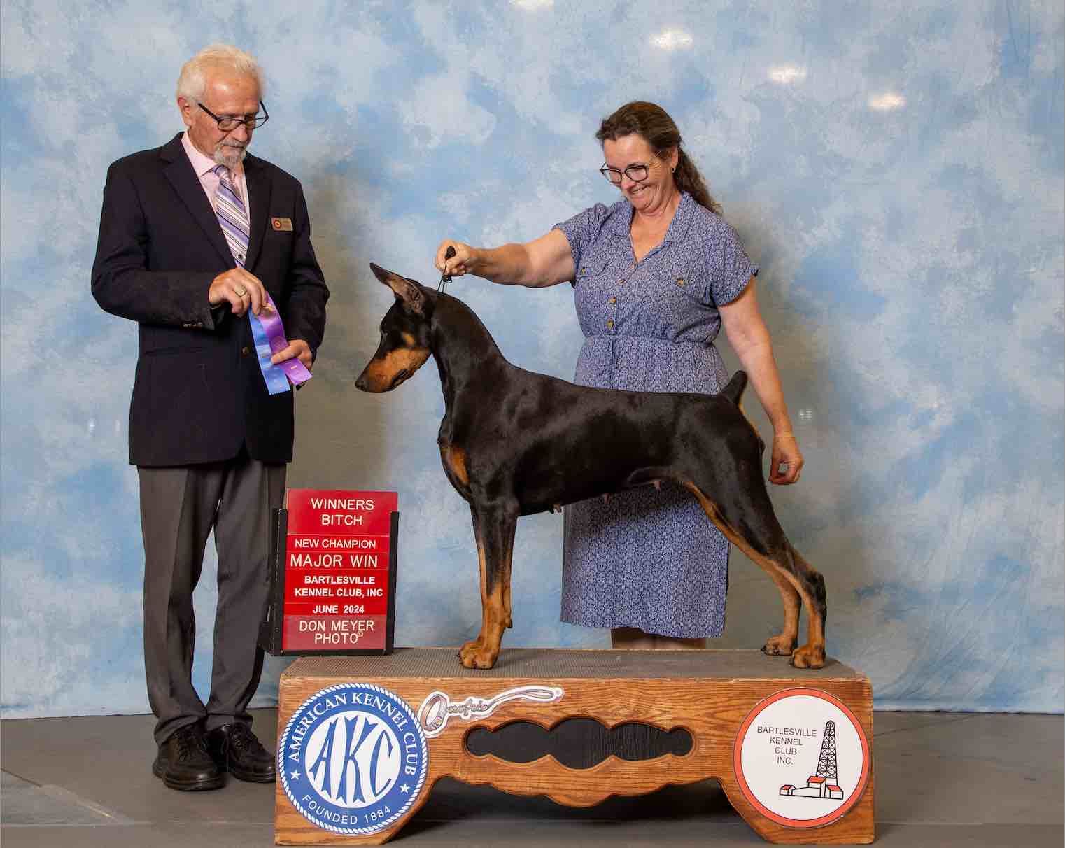 We strive to produce an all-around Doberman. We are working to maintain a true Doberman temperament in a dog that can also have success in the show ring. We participate in both conformation and working events.