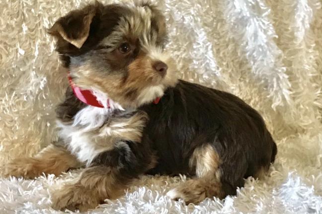 Dark Chocolate with markings. Great temperament, excellent Mother. 5.5 lbs.
