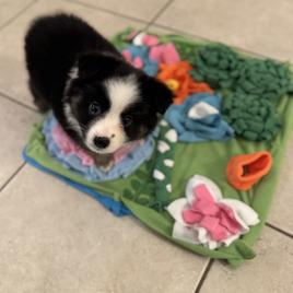Shantele was easy to work with. My daughter named her Millie. She is already sitting, giving paw, and laying on command and has even started ringing the bell to go potty outside. We love the new addition to the new family.