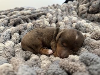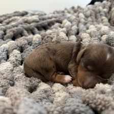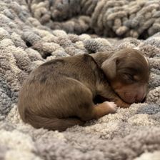 Kimber is a chocolate and genetically cream dapple female, PRA clear. 8lbs.