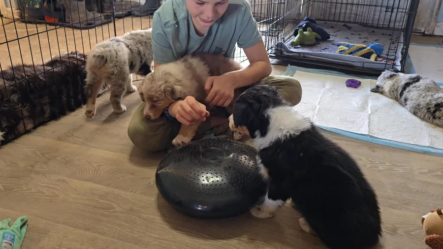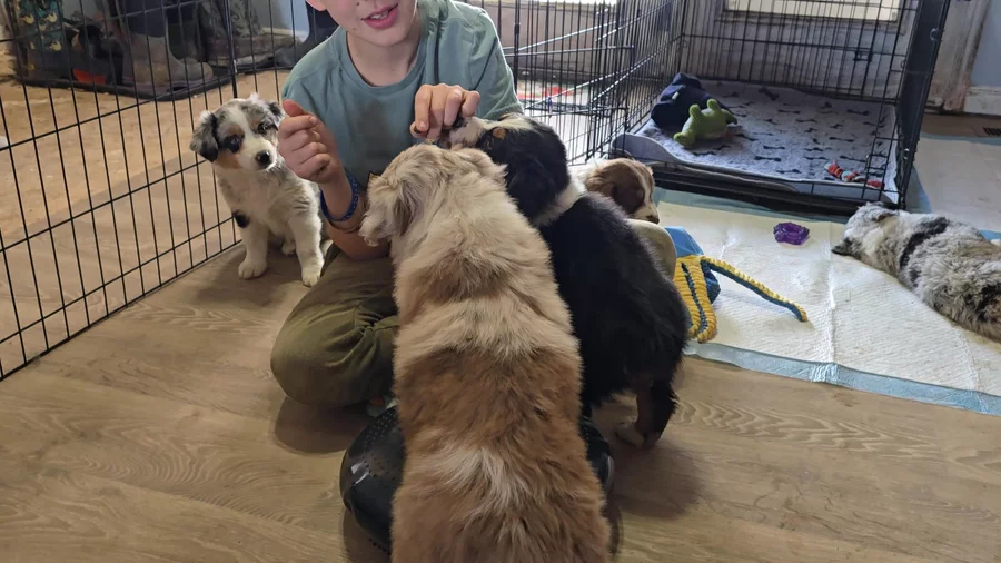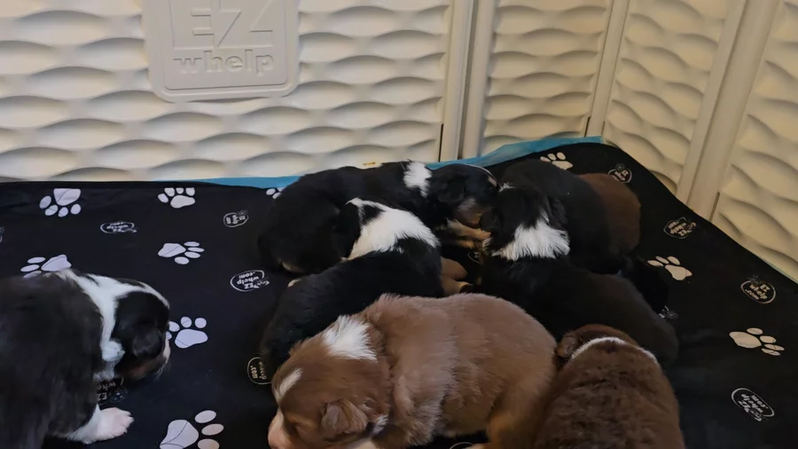 Our puppies include black, red merle, blue merle, red, and black tri-color. Colors will vary depending on the parent dogs.