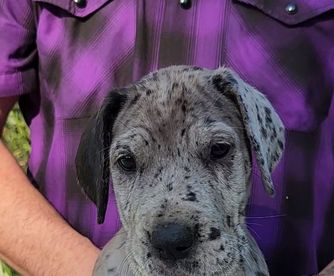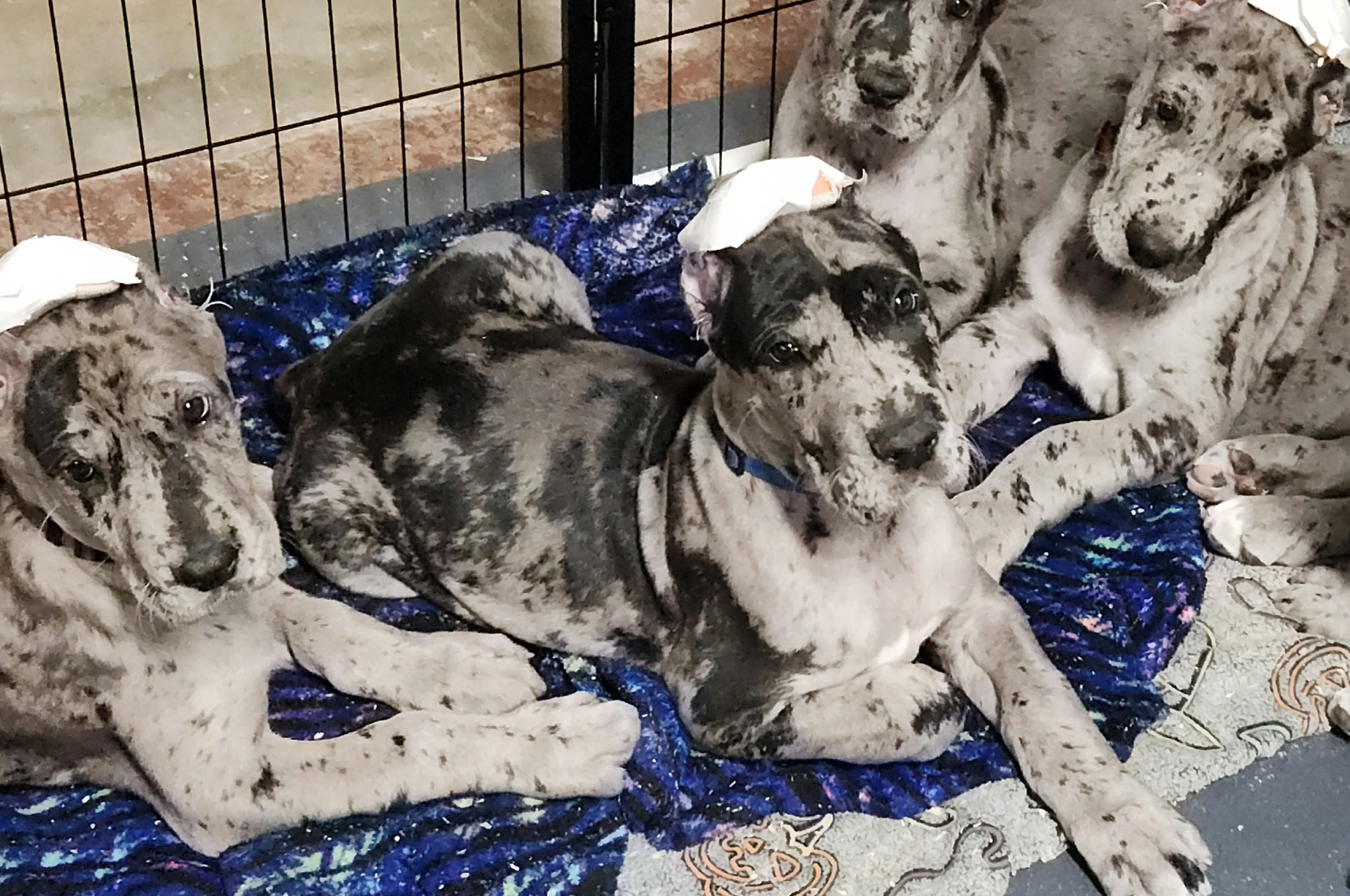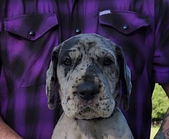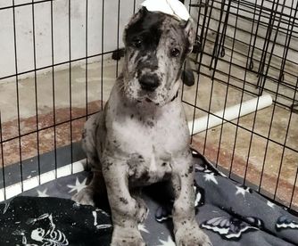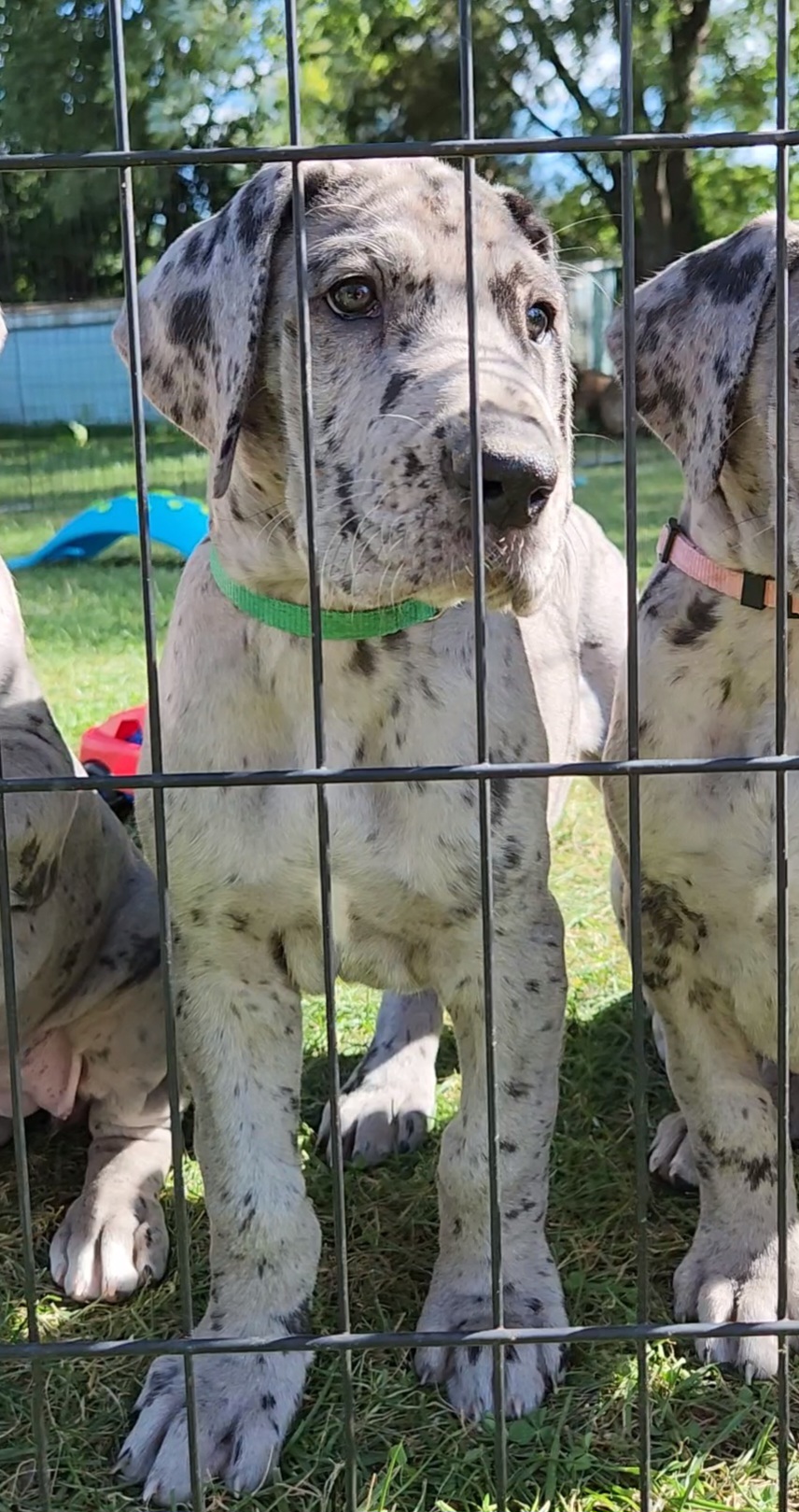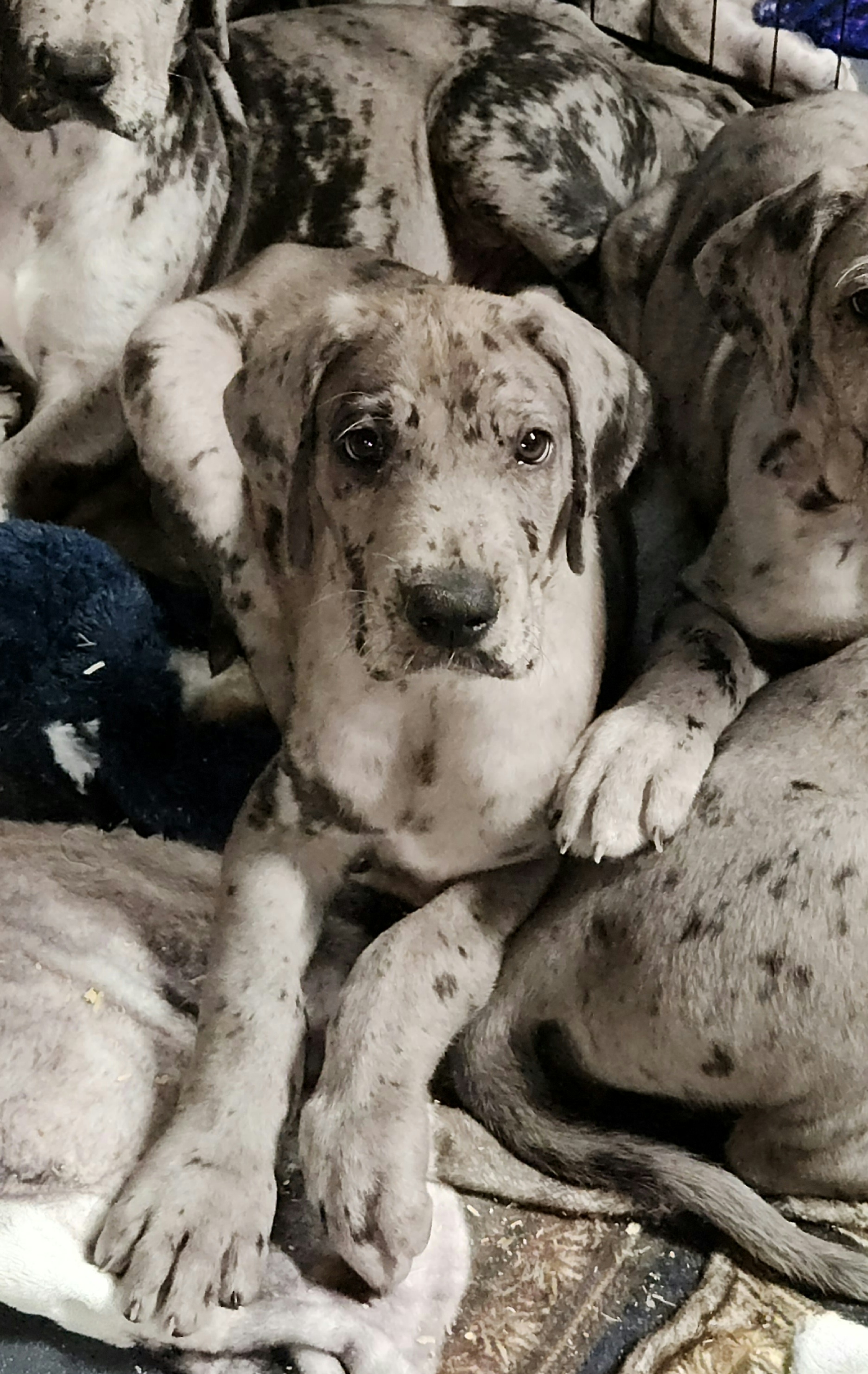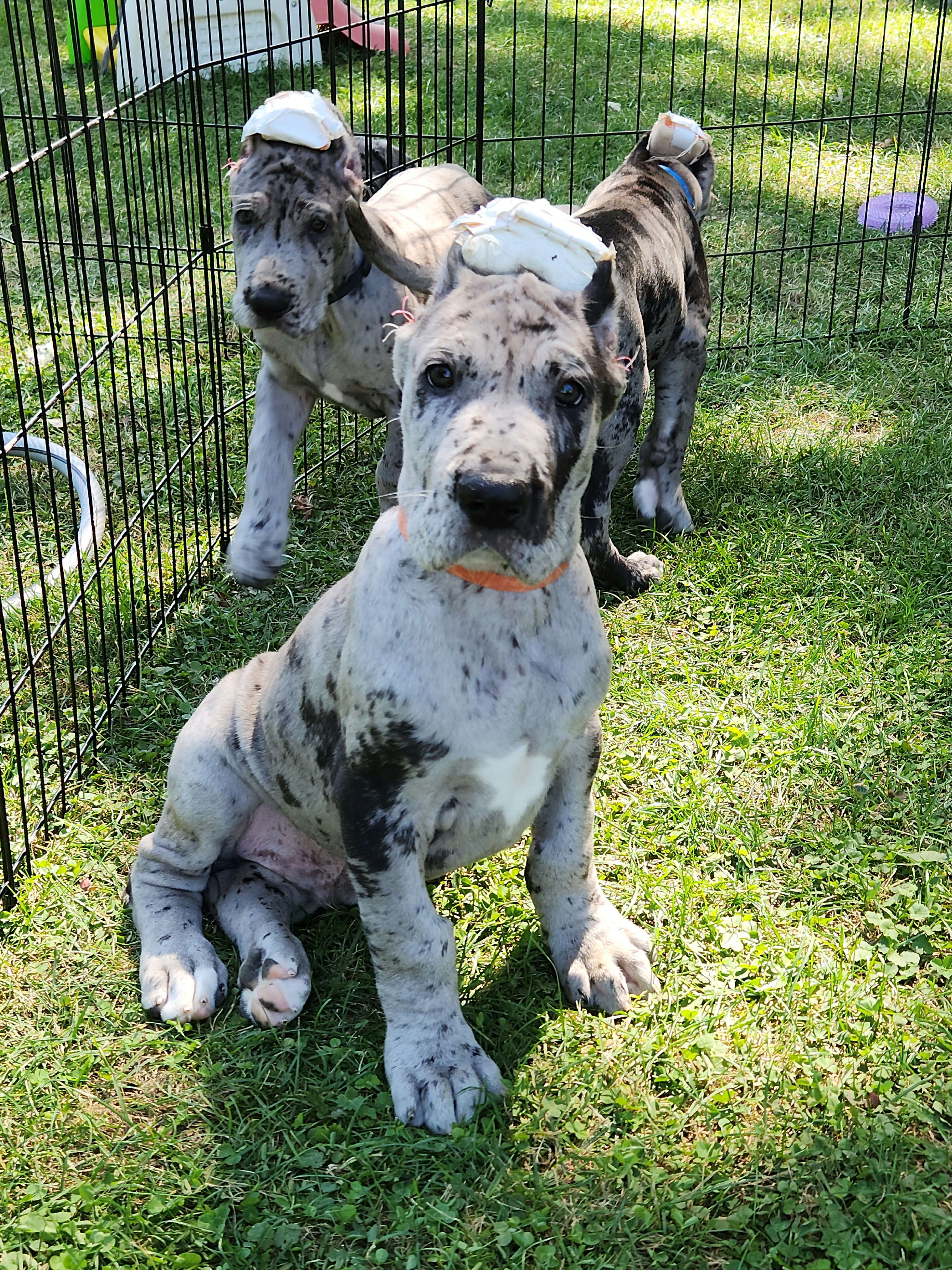 Our Miniature Bull Terrier puppies include black tan and white and black and brindle. Great Dane puppies include mantle merle, black and white, harlequin, mantle, and merle. Colors will vary depending on the parent dogs.