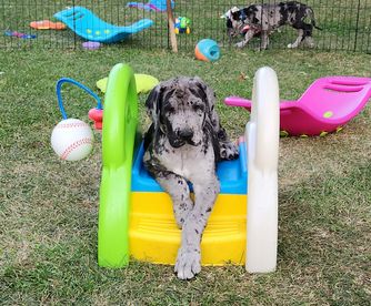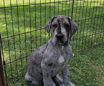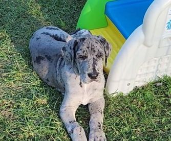 Ditto is an old soul at heart. She loves to have company and will hang out on the couch or outside if that's where you are. She loves to run laps around the 2 acre yard and wrestle with her bully sisters. She is very gentle by nature and enjoys sunbathing on a spring or fall afternoon. While she is a quite dane, she is still very athletic and loves a good rabbit chase!