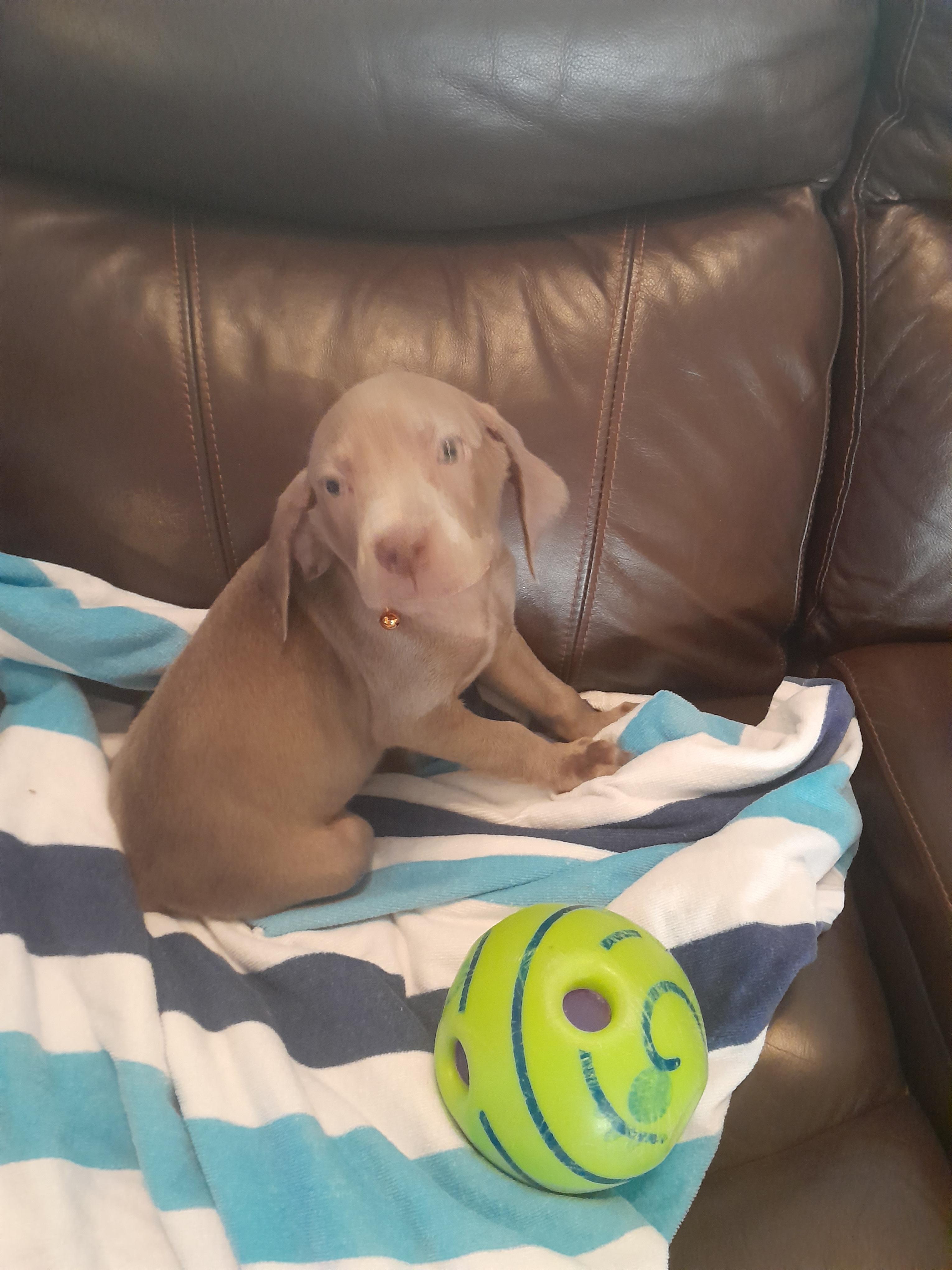 Sheba is a female Weimaraner. Carefully selected as a great representative of her breed, Isaih decided to make her part of their program. Isaih has passed Good Dog’s screening process, which involved a review of their breeding practices, environment, and the mental and physical health of their dogs.