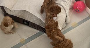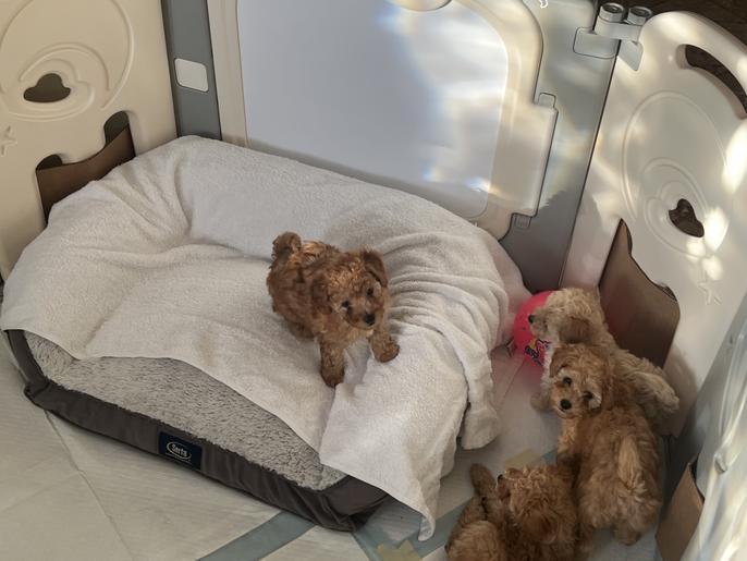 I'm Roberto G., the breeder behind ItalianToyPoodles located in Victorville, CA. Penny was born in Salerno Italy in June 2024 and came to america in August 2024. She met Peppe a smaller than her beige male in August 2024 and she came back with me to America and had 5 beautiful toy poodle puppies. Puppies had parvo vaccine and soon to have deworming vaccine.