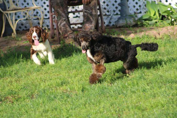 Our English Springer Spaniel puppies include liver white and tan, black and white, liver and white, and black white and tan. Poodle puppies include apricot, black, brown, cafe au lait, cream, red, gray, silver, white, parti, phantom, and brindle. Colors will vary depending on the parent dogs.