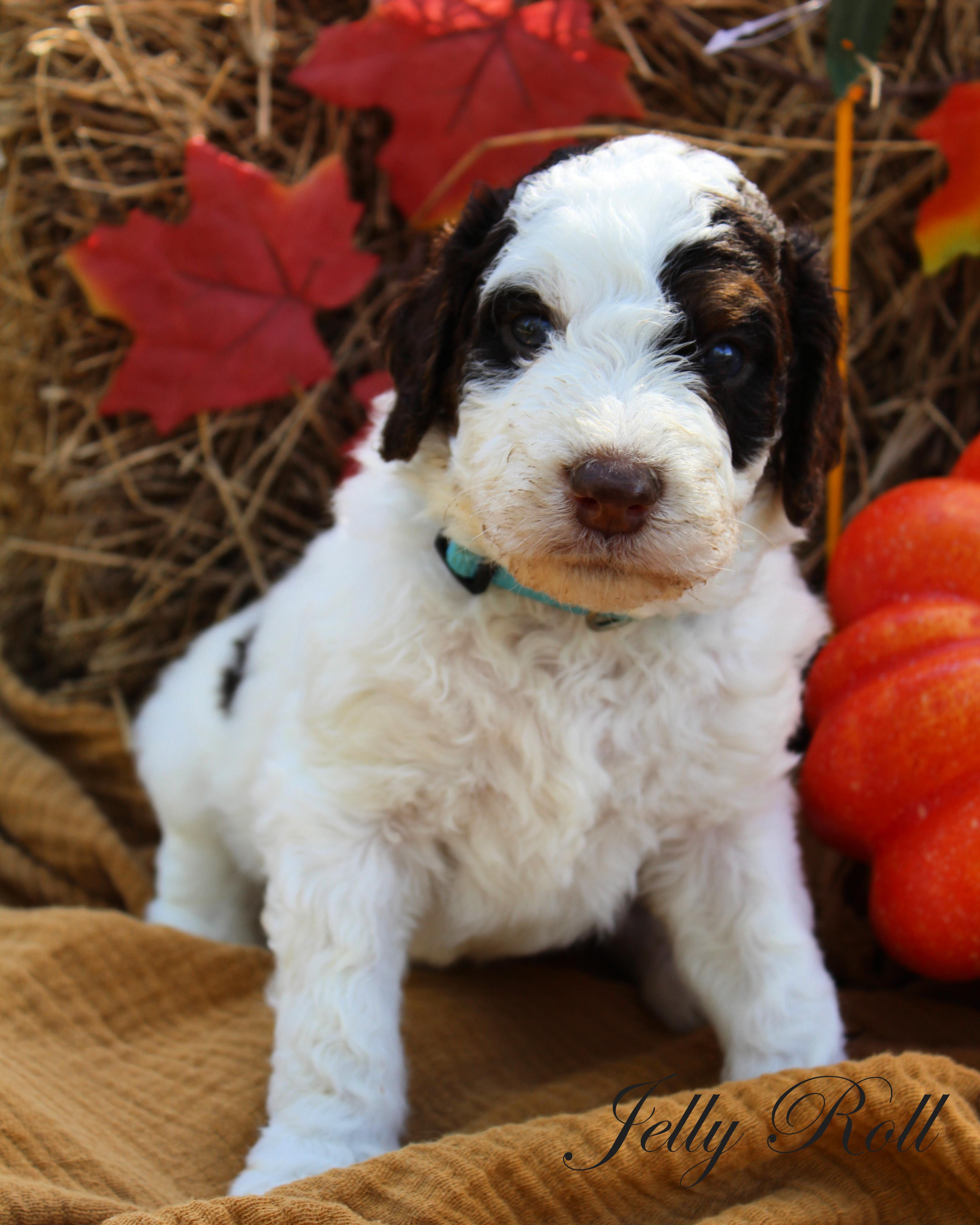 Our handsome sire, Auggie, is an exceptional F1 Aussiedoodle with a charming personality and a strong, healthy build. He has a beautiful brown, white coat, expressive eyes, and a friendly, intelligent demeanor. Known for his affectionate nature and loyalty, Auggie loves being around family and is good with children, making him a wonderful companion.