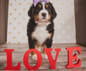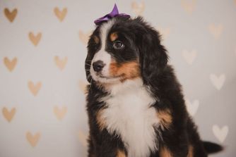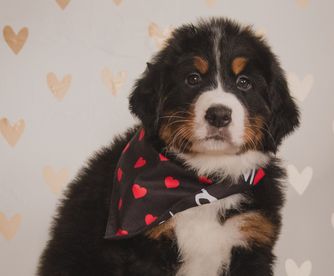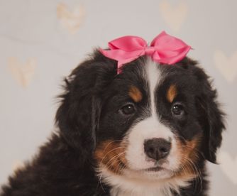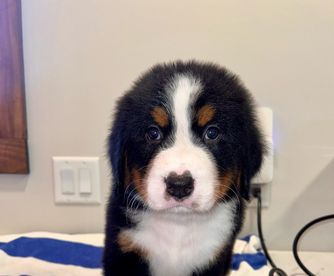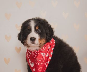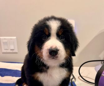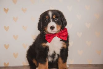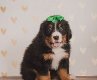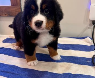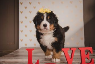Our Bernese Mountain Dog puppies are black rust and white. Golden Retriever puppies include dark golden, golden, and light golden. Colors will vary depending on the parent dogs.