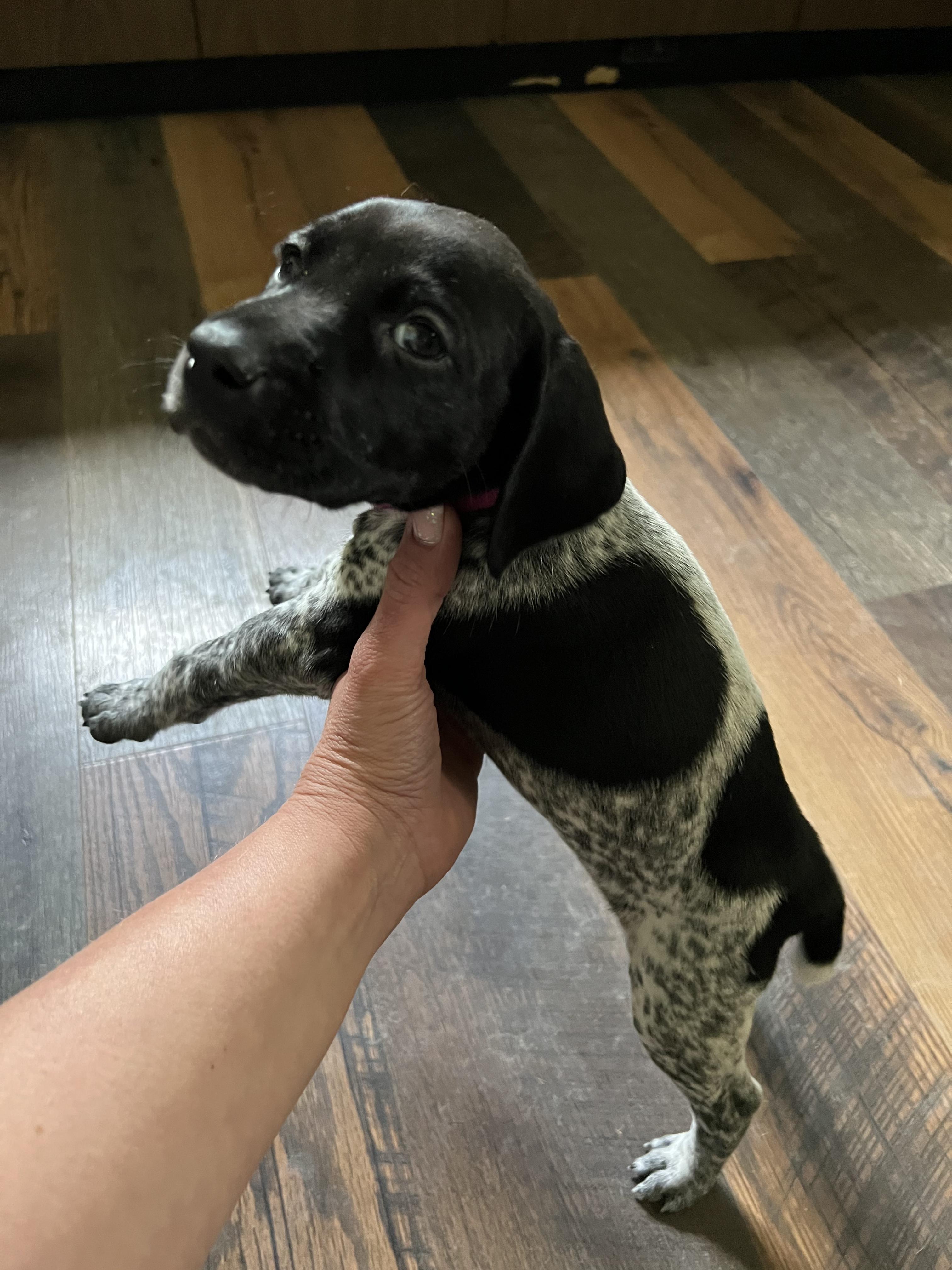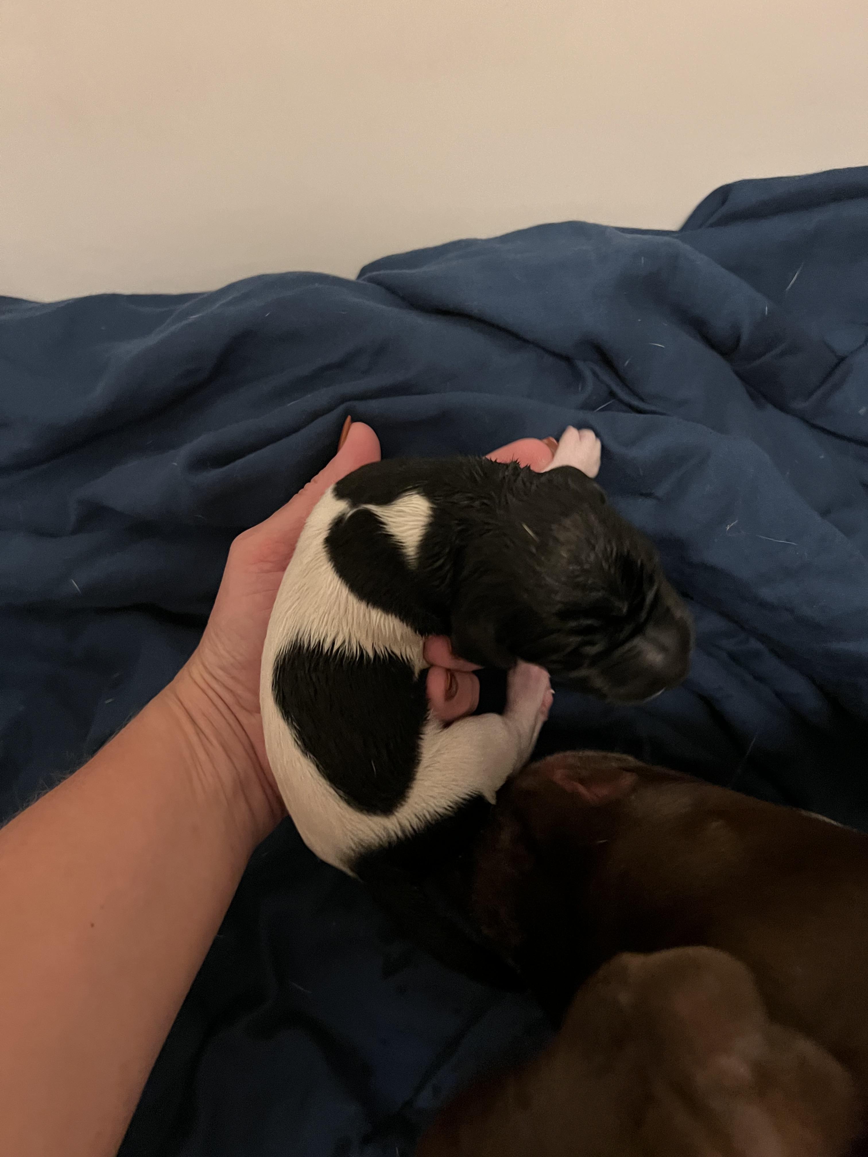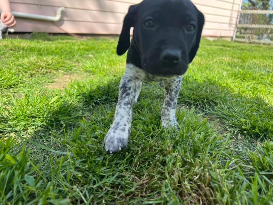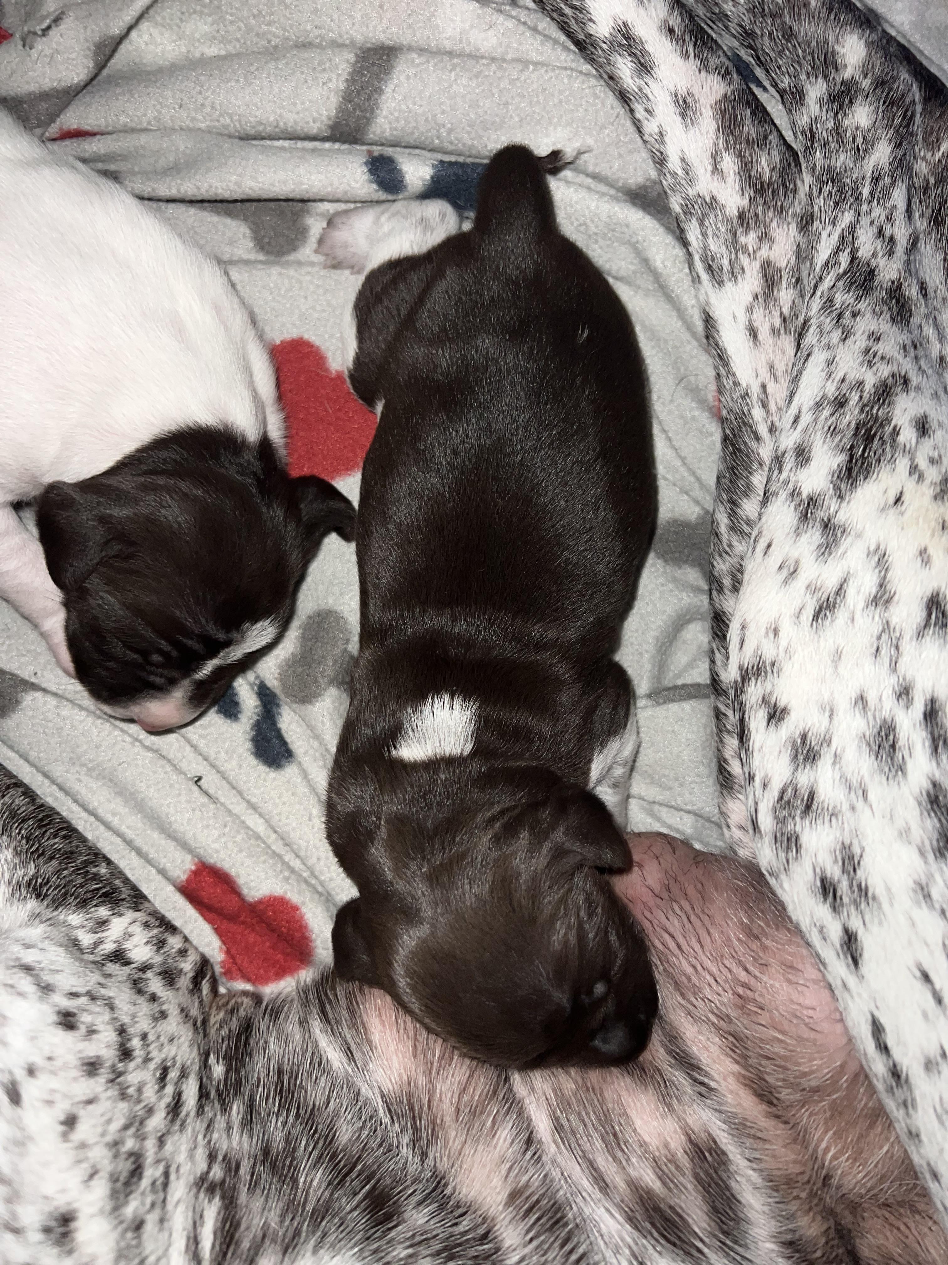 Our puppies include liver and white, black and white, liver roan, and black roan. Colors will vary depending on the parent dogs.
