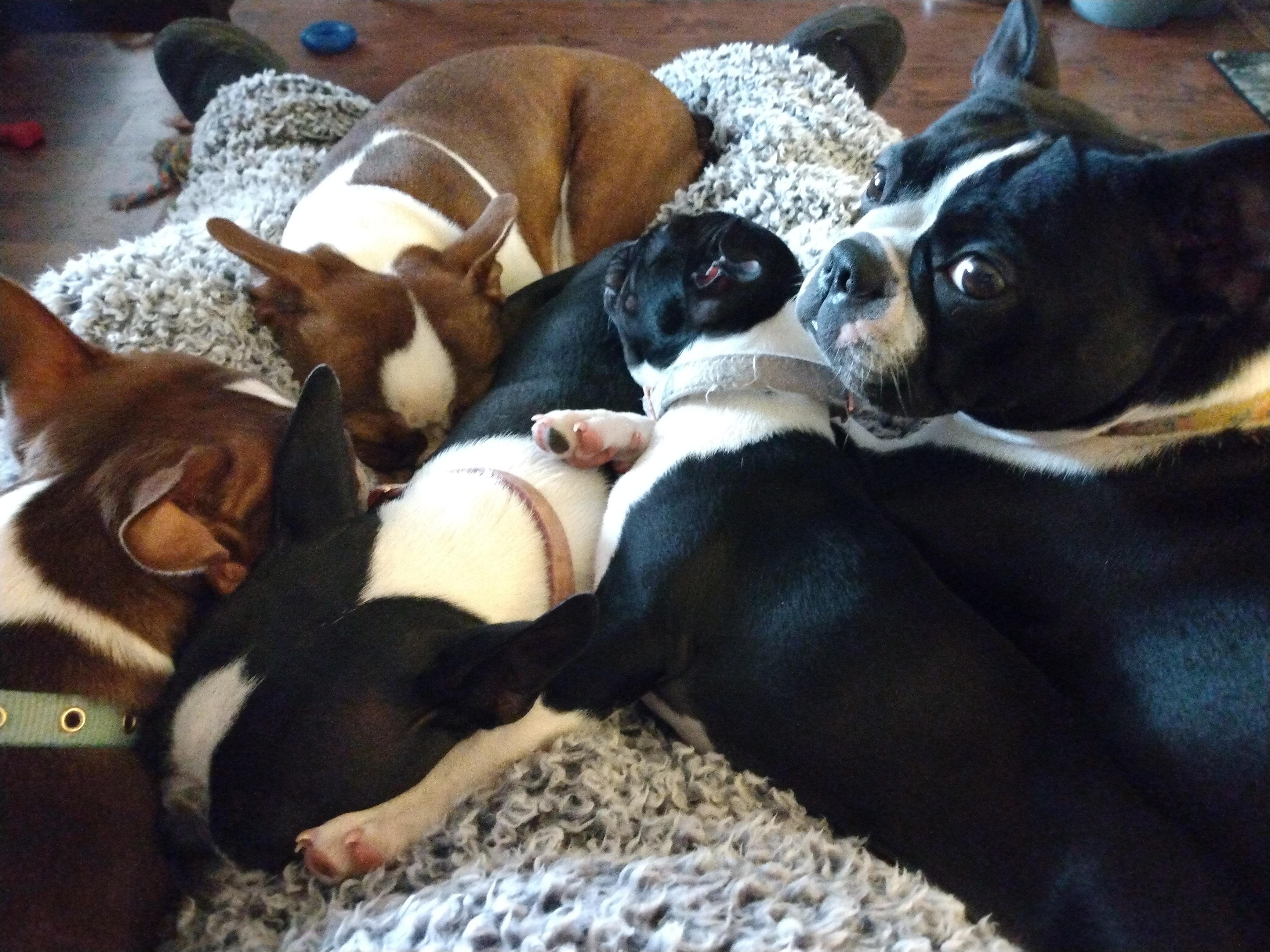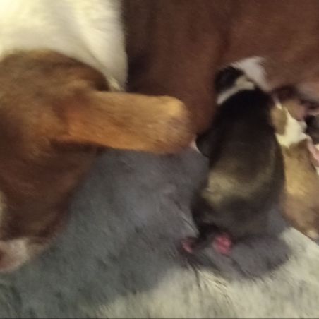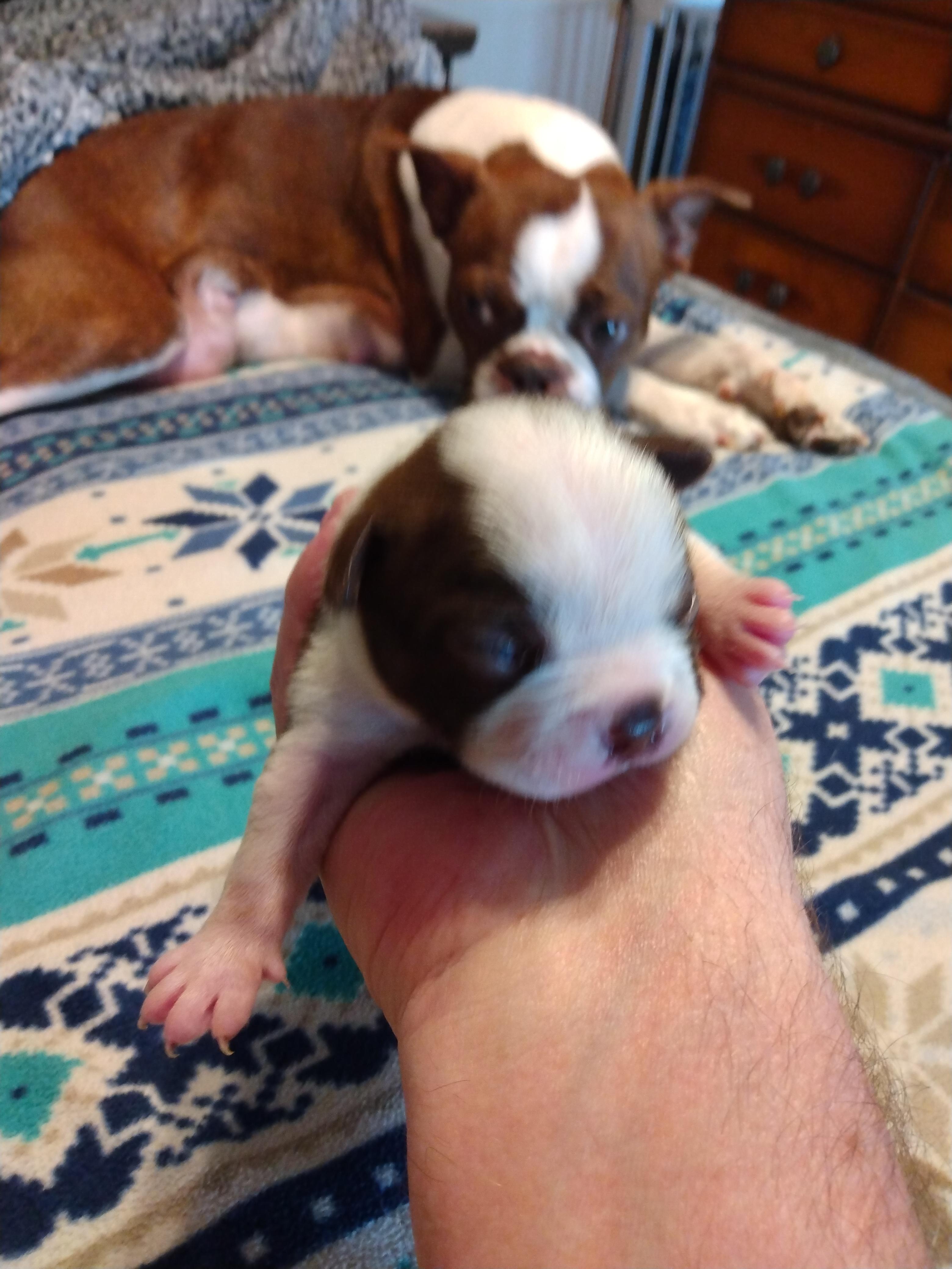 Lady Luna is a very smart girl and loves affection and gives lots of loves. Plays well with my other Bostons and loves her toys. Her color is coming out more as black brindle and white as time goes on. She is CKC Registered.
