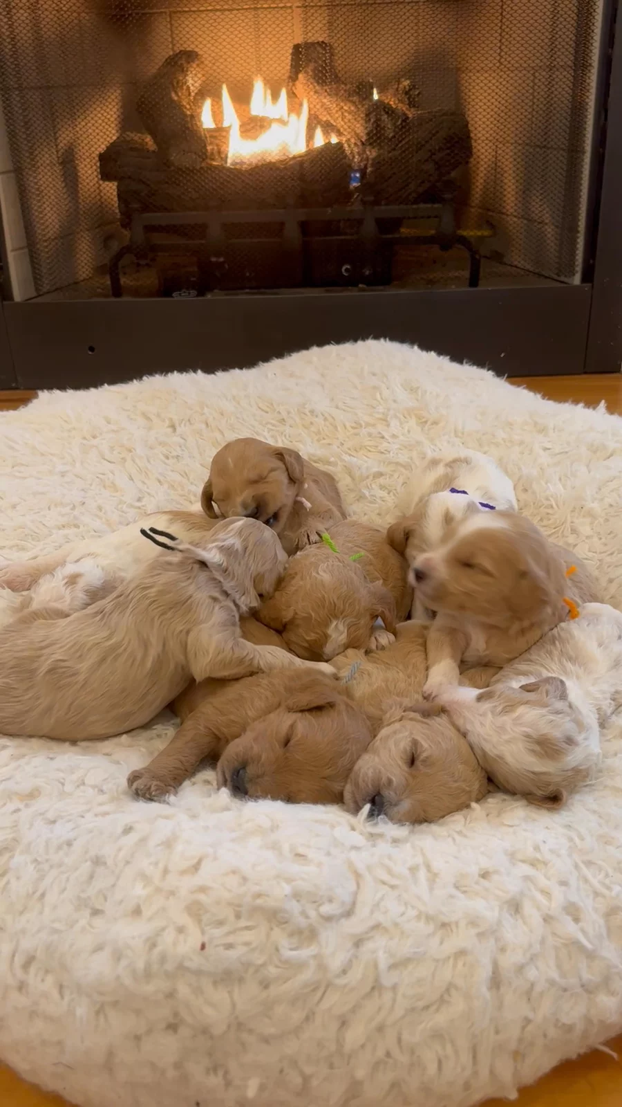The puppies are raised by us in our home. We are a growing family with a 9-year-old son 6 and 3 year-old daughters + baby girl.  They interact with the puppies all the time, so the puppies are used to being around little ones. They are introduced to our goldendoodle, Douglas, as well as any other visiting mamas. We train the puppies with Puppy Culture + are passionate about them and our customers