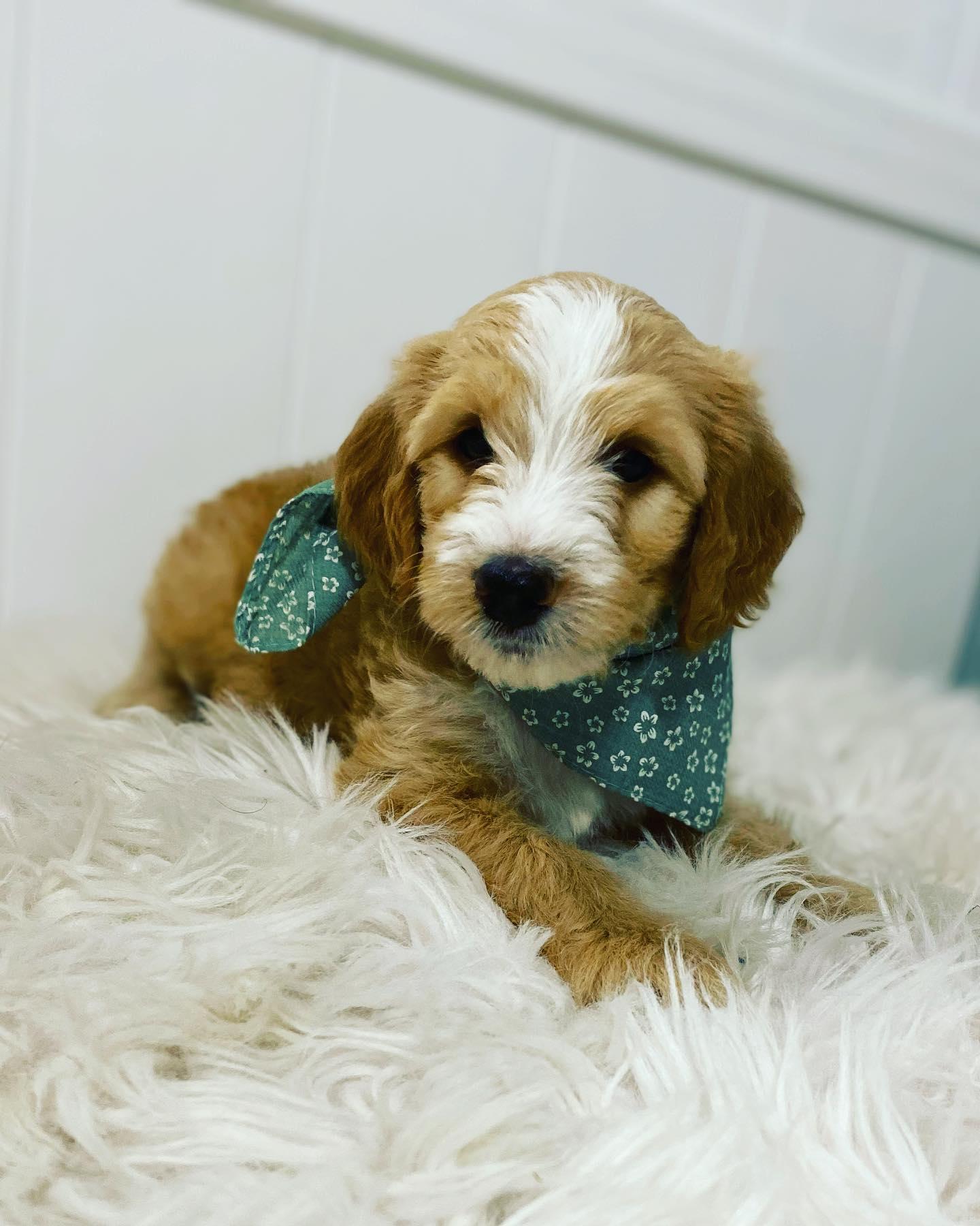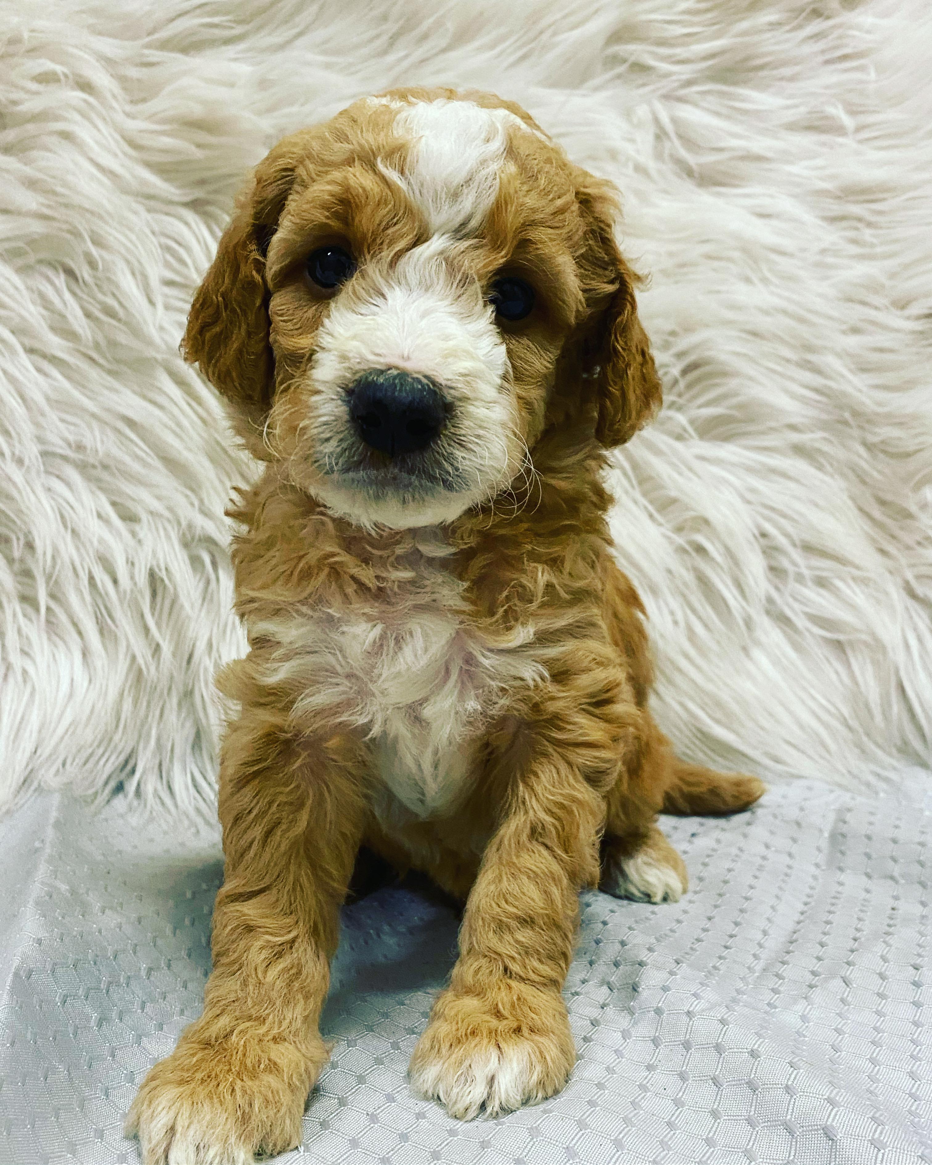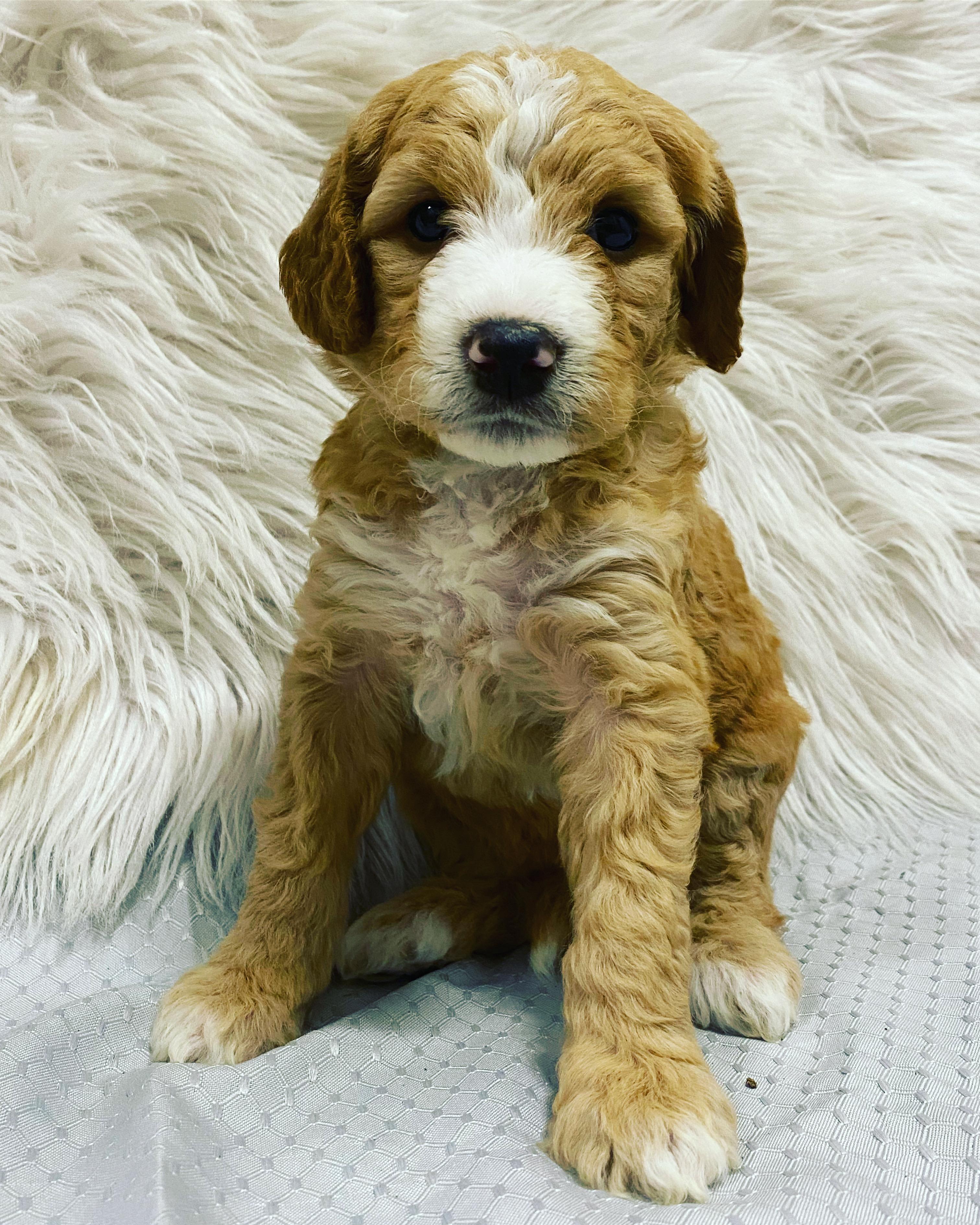 Our Cockapoo puppies include red and white, red, golden, cream, black and white, buff, and brown. Goldendoodle puppies include cream, apricot, red, and black. Bernedoodle puppies include sable, black, black and white, tri-color, and phantom. Colors will vary depending on the parent dogs.