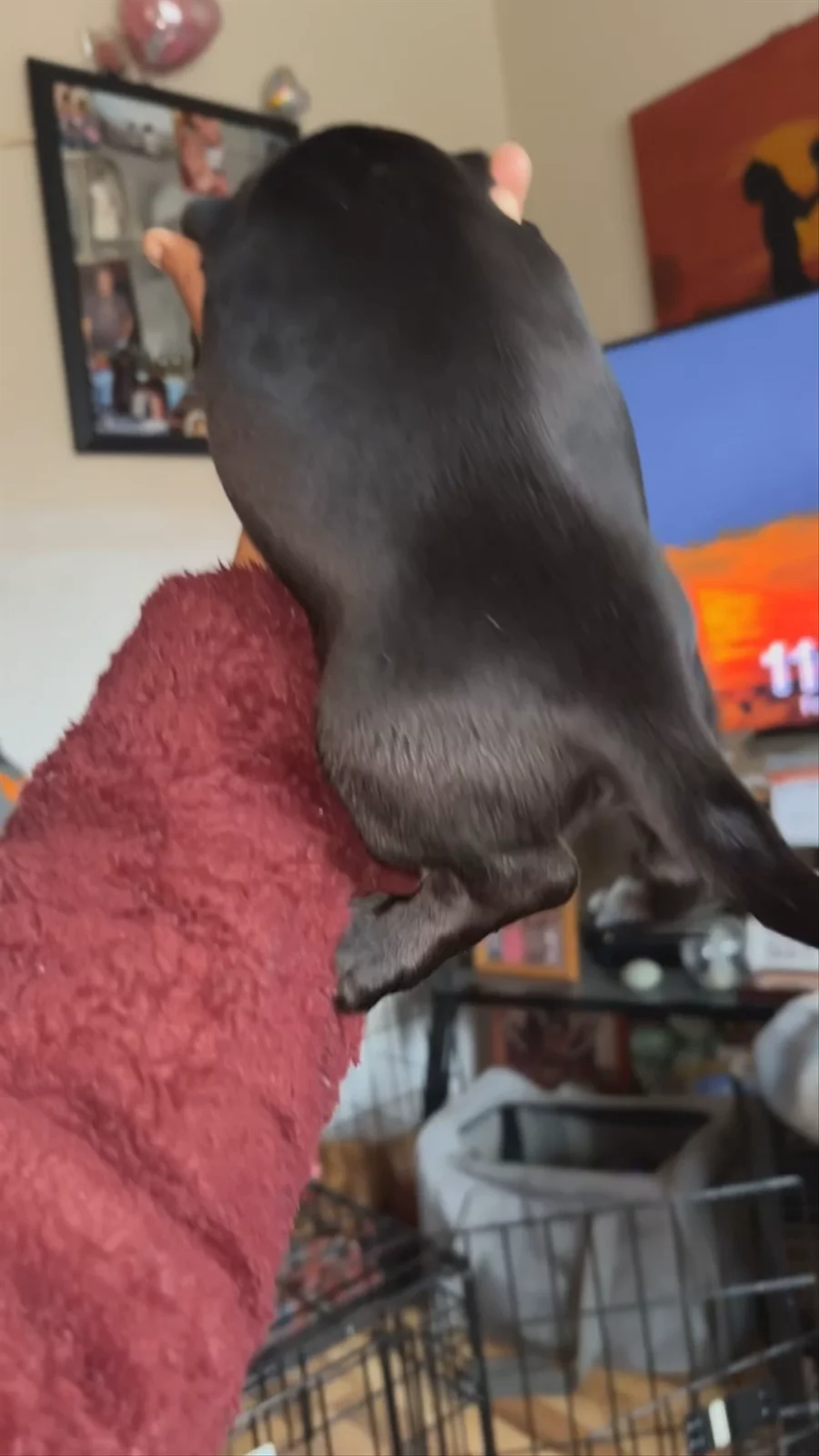 The last available dog. All black female. No markings. She is coming out to be just like her dad