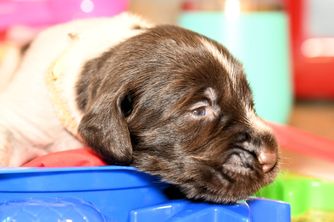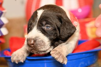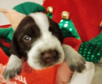 Our puppies are liver and white. Colors will vary depending on the parent dogs.