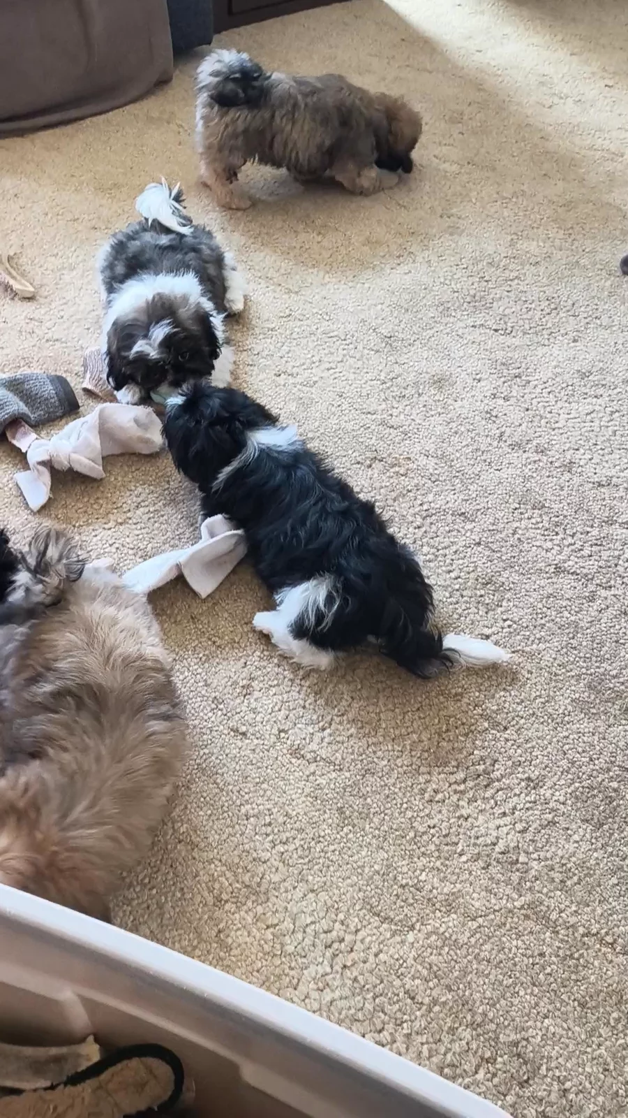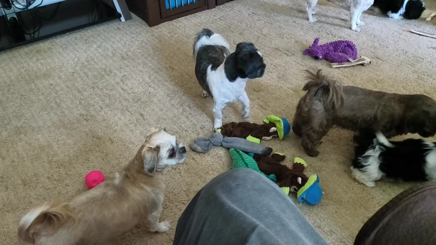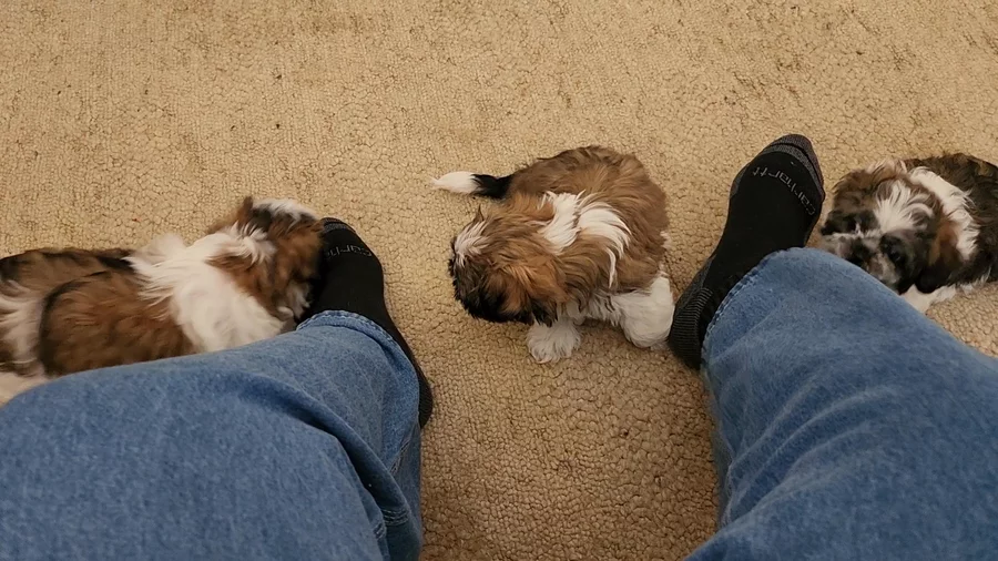 We have our Shih Tzu's in our home and on our laps as true members of the family. We only have one or two litters a year and our puppies live in home with us. There is rarely a time that we are more than a few yards from them. Our puppies are never on paper or dirt. We have puppies on towels and blankets from day 1 and we have a electric and water bill to prove it. 😉