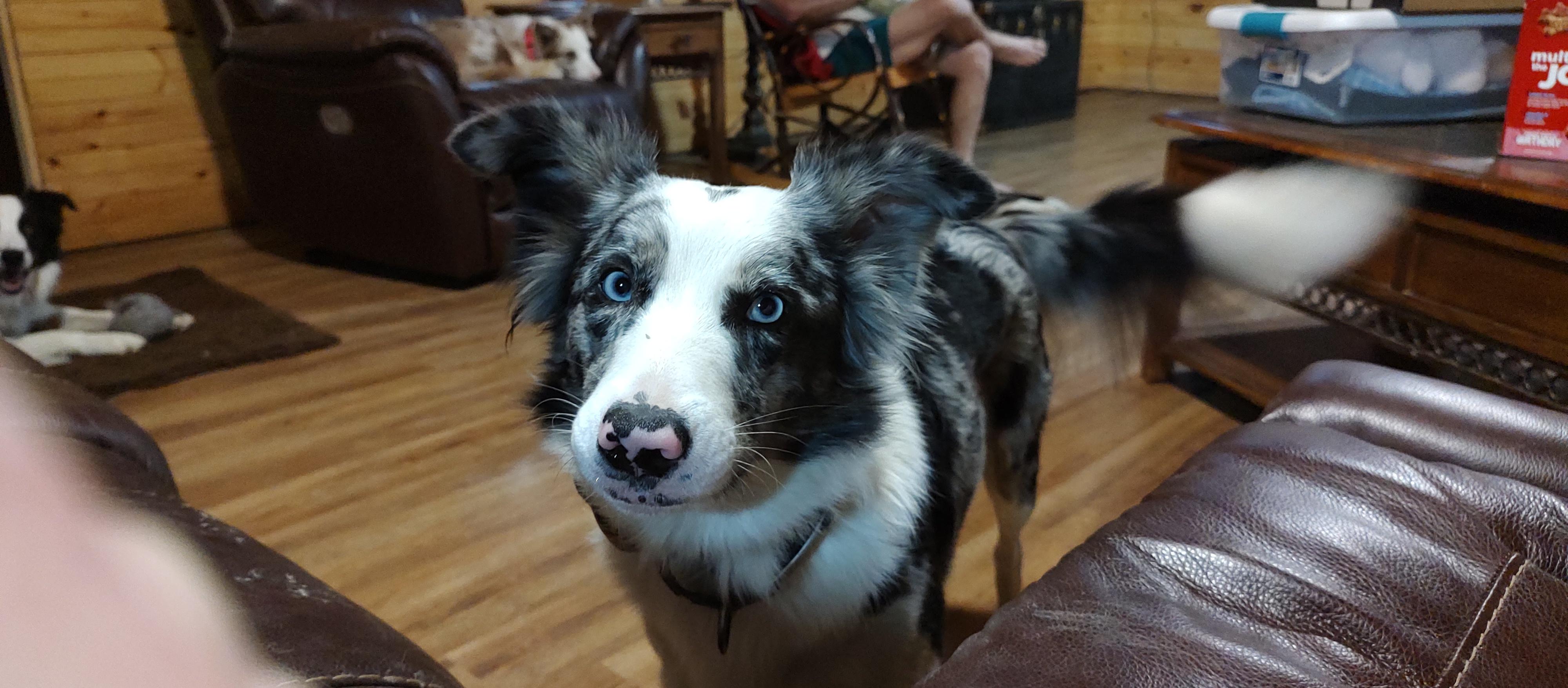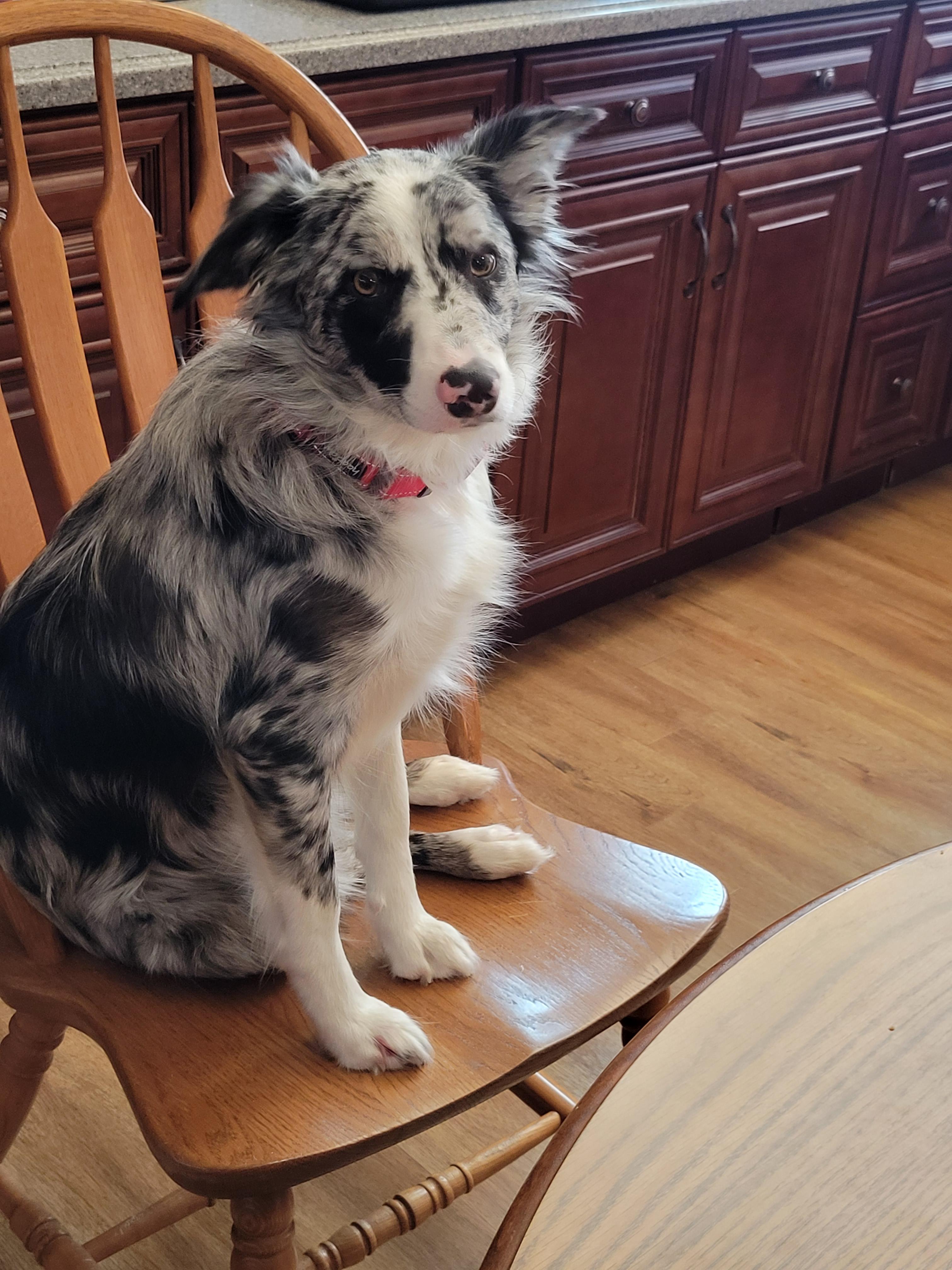 Ember is a beautiful blue Merle with blue eyes, she love people and other animals. Ember is one of puppies that we kept and raised in our home with our other dogs.