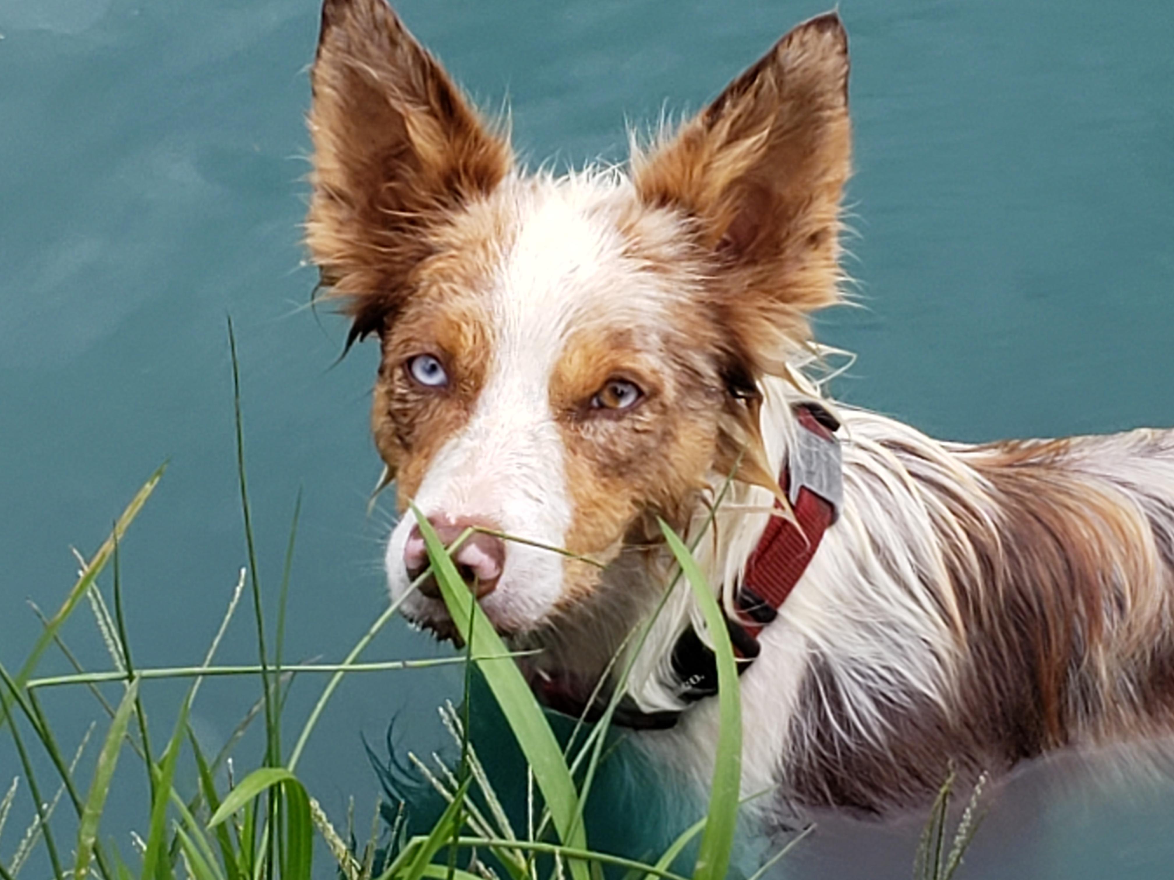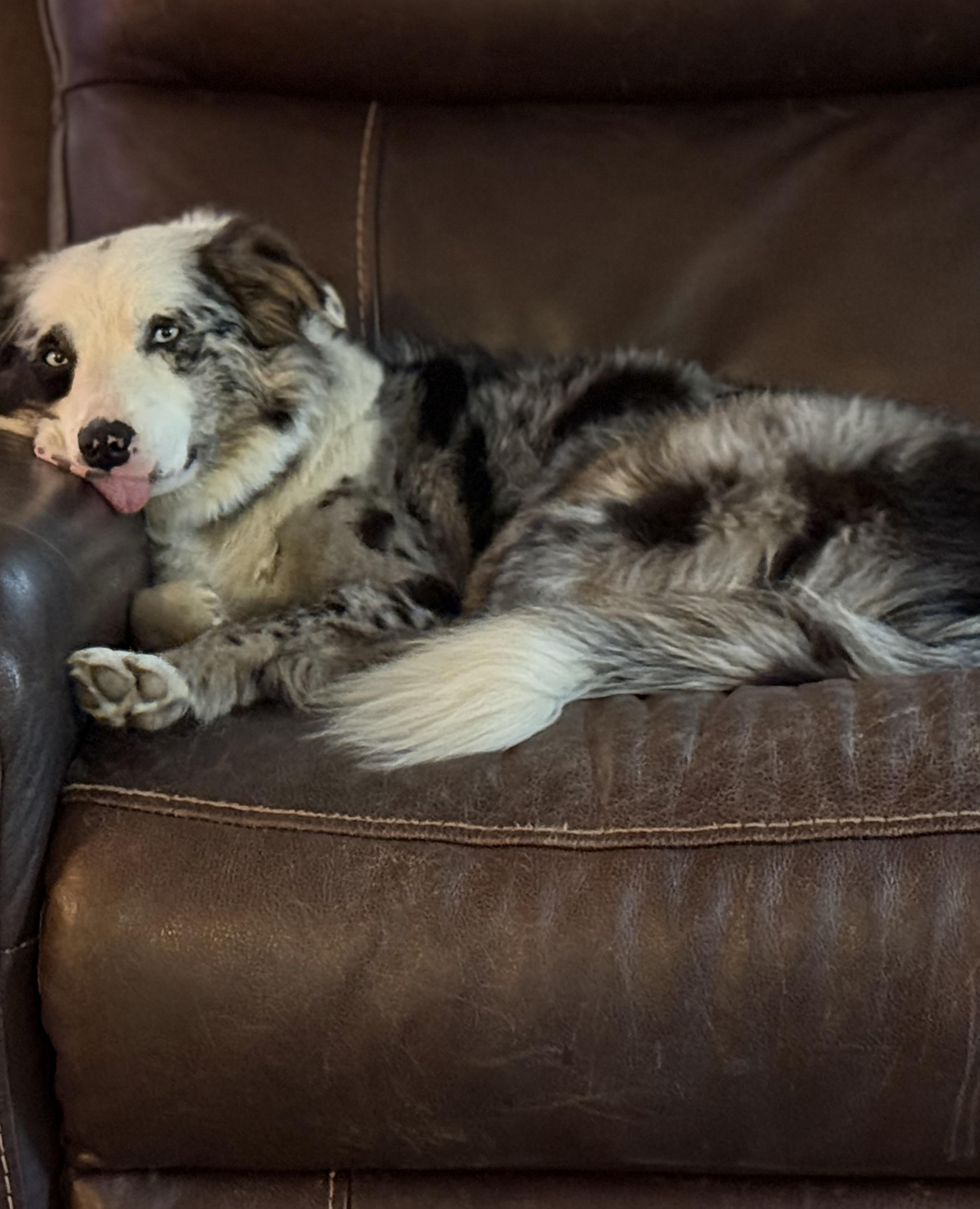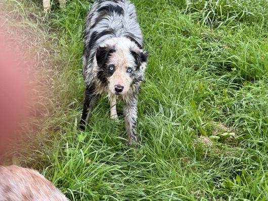 Mystic is a blue eyed blue Merle tri with calm and gentle disposition. She is genetically cleared through Wisdom Optimal Selection.