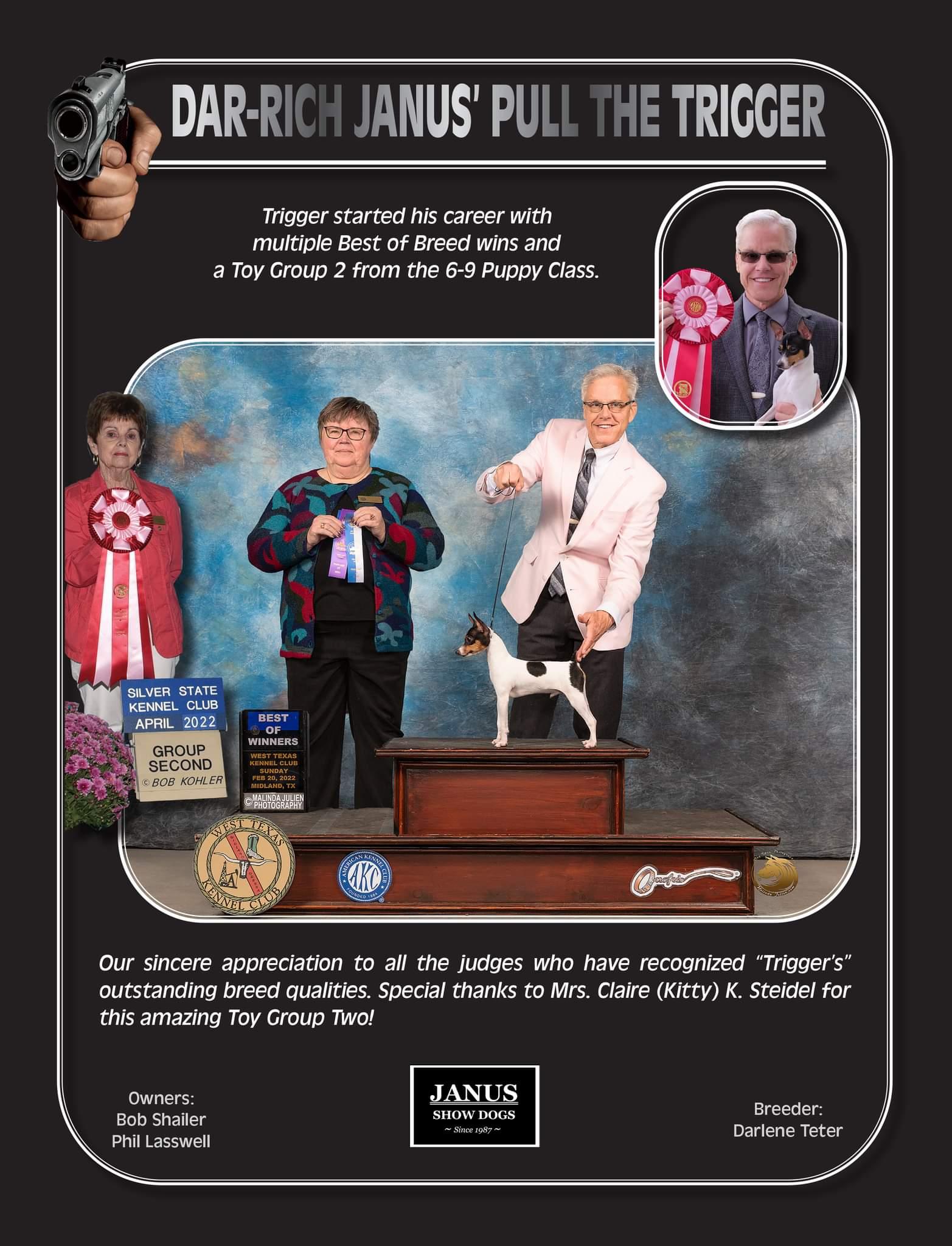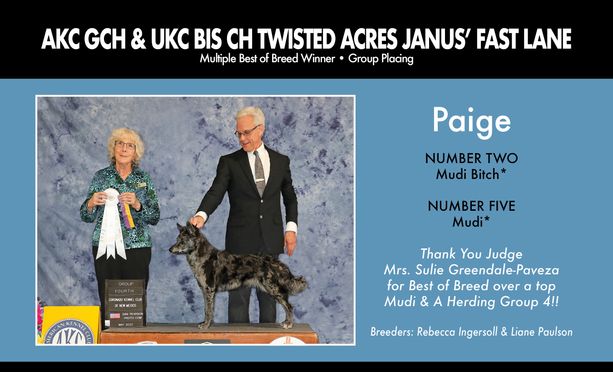 I'm Bob S., the breeder behind JANUS Mudis & Toy Fox Terriers located in Benson, AZ. Bob Shailer & Phil Lasswell started breeding and exhibiting group winning and placing Chow Chows at AKC conformations shows in 1987 under the program name "JANUS". In 1991, we added Japanese Chins. We bred and exhibited group placing Chins. We owned the Top winning Japanese Chin in Canada in the early 90s. We also bred and raised champion Alpacas for 26 years. In 2013, we retired from Spokane to Benson, AZ (30 mile SE of Tucson). In 2019, we obtained our first black merle Mudi female, "Paige", who became the first Mudi to ever win Best In Show at a UKC show. She is a GCH CH Group placing bitch with AKC. We selectively breed to the best dogs possible with good depth of health screening. We do all the proper health testing for both breeds. Our dogs live in our home and travel in our RV to dog shows. They all swim in our pool and go for daily walks around the neighborhood. We want well socialized and sound dogs to live in the real world!
