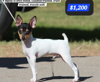 Our Mudi puppies include black merle and black. Toy Fox Terrier puppies include white black and tan and white and tan. Colors will vary depending on the parent dogs.