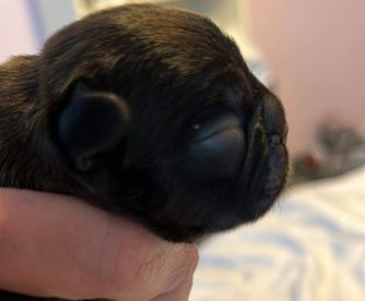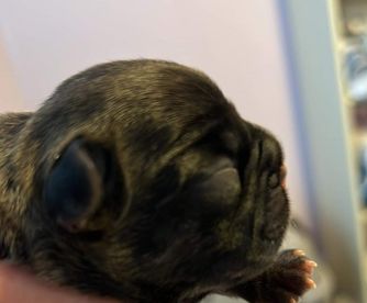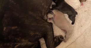 Stella is a black brindle with white on her chest. She carries for dilute, cream, fawn, pied