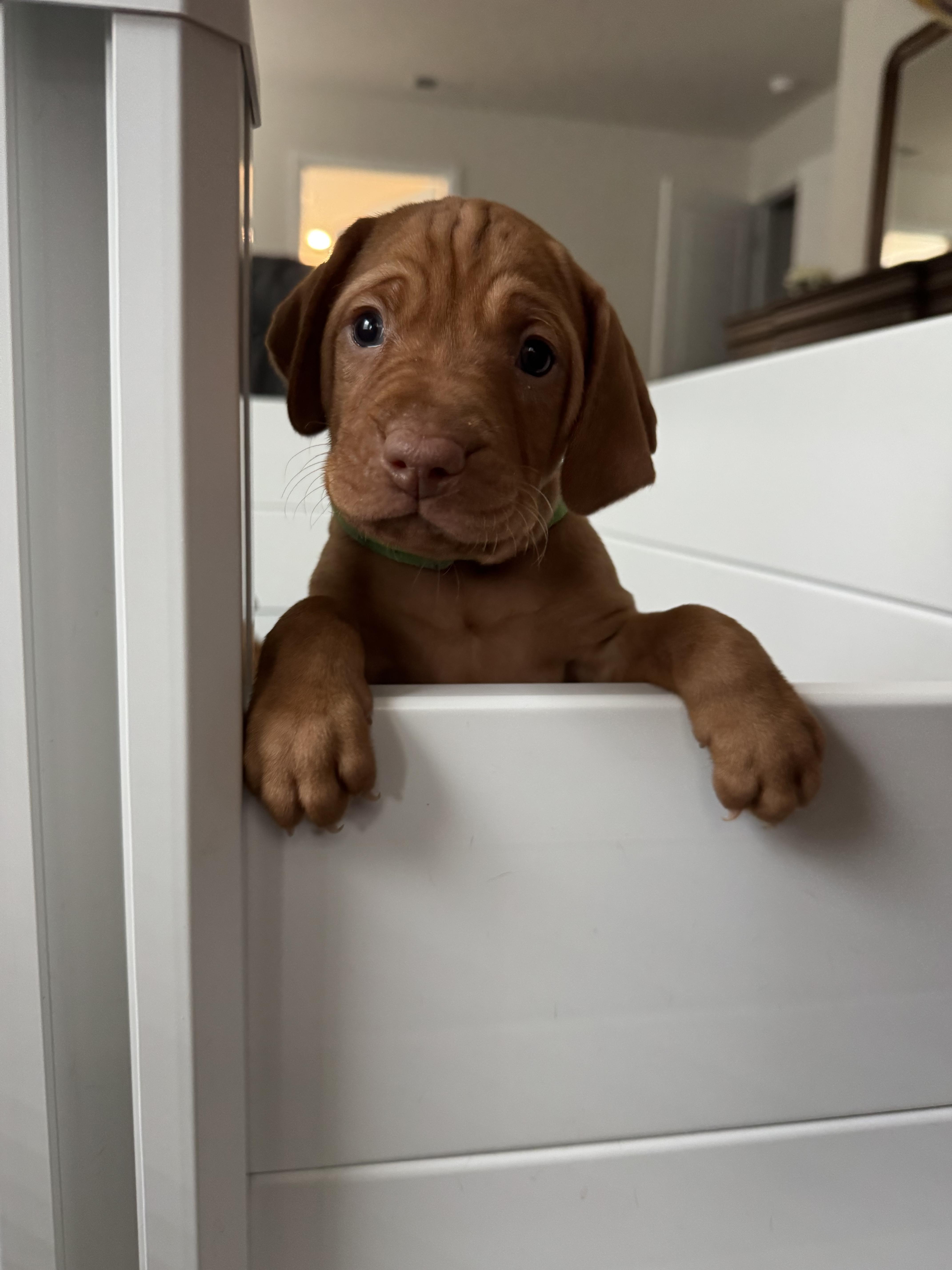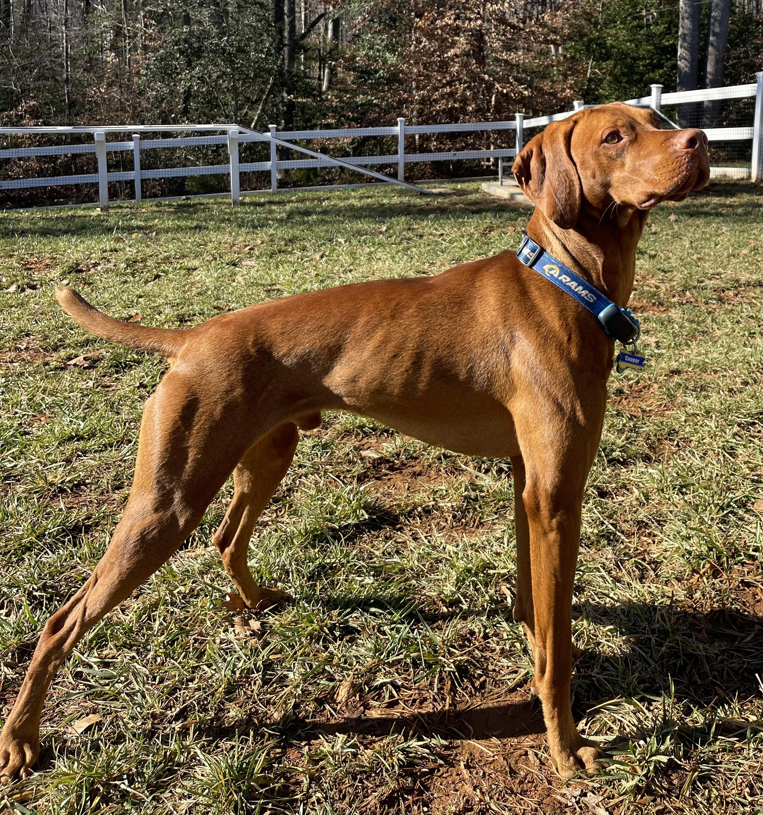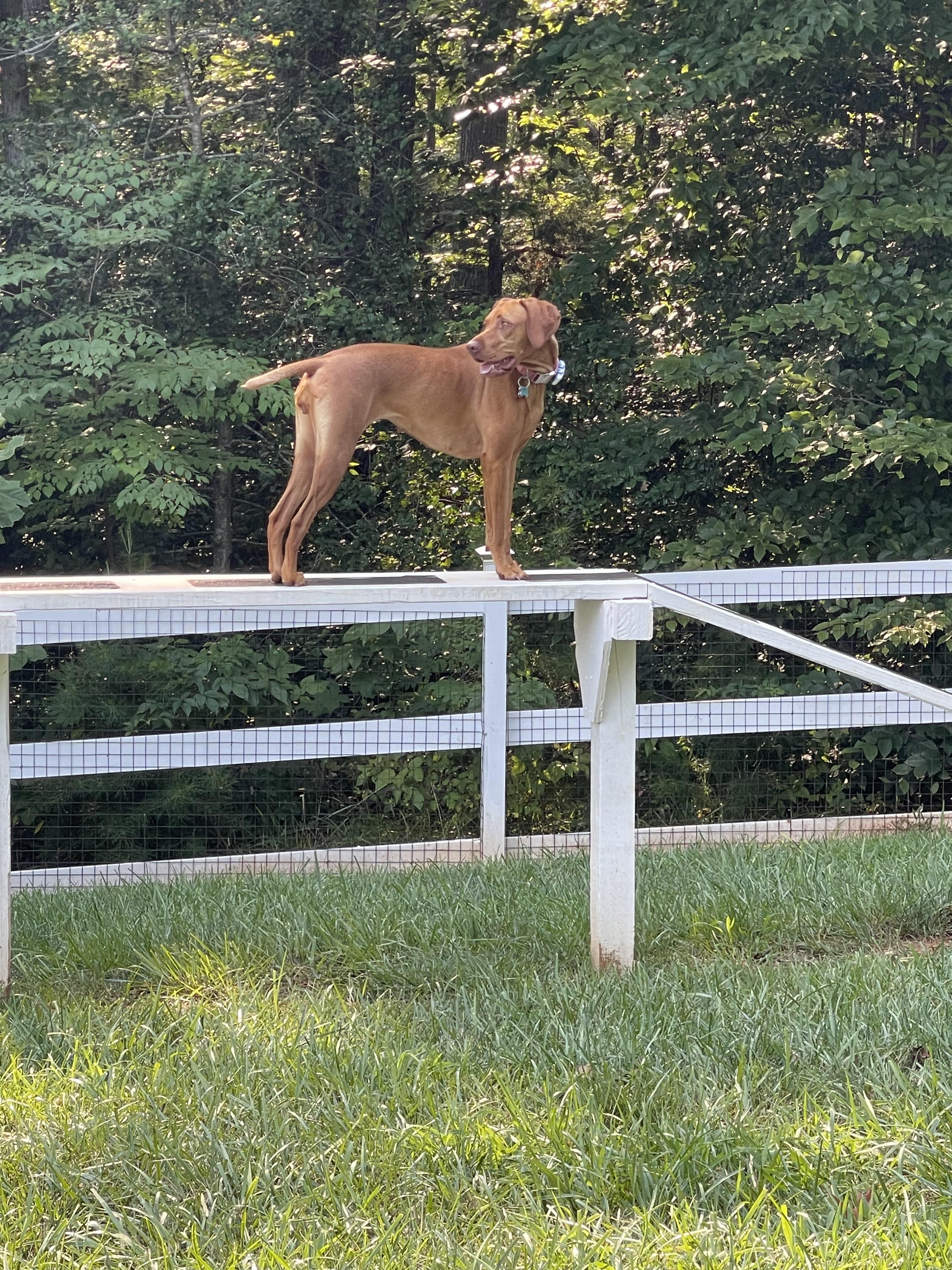 Cooper is a gentle sole with an amazing energy. He is a loving, loyal, energetic companion. His favorite activity is to fetch a ball or frisbee and has a natural instinct to point and watch birds. Very social enjoys other dogs. Training was easy due to the breeds intelligence. He protects the family with his barks and at night he cuddles on the sofa. Love my Vizsla!